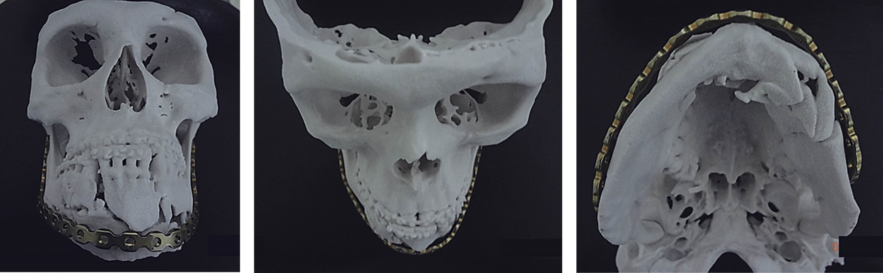 Se procedió a la limitación del daño en las siguientes 24 horas. El procedimiento se llevó a cabo con el paciente bajo anestesia general; consistió en lavado mecánico, hemostasia, reposicionamiento de los segmentos óseos basales y dentoalveolares con osteosíntesis alámbrica y ferulización dental con resina. Posteriormente se planeó el tratamiento definitivo, incluyendo el uso de un modelo estereolitográfico para el premoldeado de una placa de reconstrucción mandibular dinámica (Figura 2).