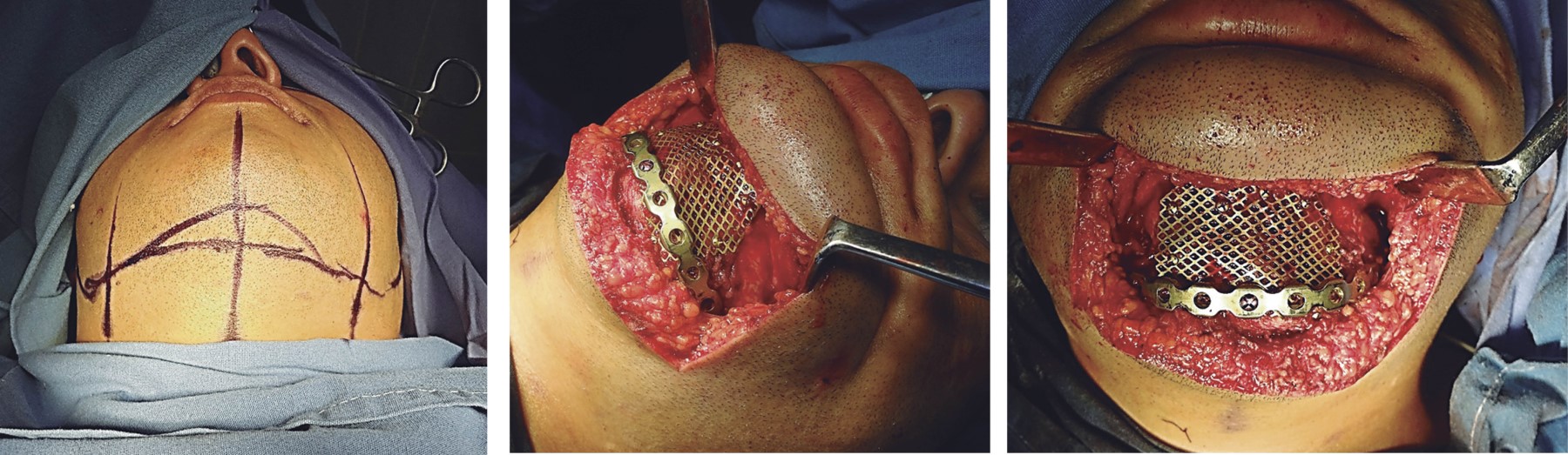 Dos días después del primer momento quirúrgico se seccionó la férula de resina y se realizó una fijación intermaxilar y tracción elástica hasta lograr el tripodismo dental en las siguientes 72 horas, aplicando los criterios biológicos de distracción osteogénica de Ilizárov, consistente en el trasporte gradual de los segmentos dentoalveolares para permitir la formación de tejido óseo en los espacios generados. Posteriormente se efectuó el segundo evento quirúrgico bajo anestesia general, con abordaje submandibular bilateral extendido desde la región antegonial de ambos lados, respetando las arterias faciales. Se realizó la disección de los tejidos hasta el plano óseo, localizando las estructuras óseas remanentes. Se colocó la placa de reconstrucción precontorneada con tres tornillos bicorticales a cada lado, procediendo luego a colocar un conglomerado biológico consistente en autoinjerto en bloques de cresta iliaca anterior izquierda y xenoinjerto particulado bovino más fibrina rica en plaquetas (FRP), revistiendo el lecho quirúrgico y cubriéndolo con una malla de titanio antes de la reposición y síntesis de los tejidos blandos (Figura 3).