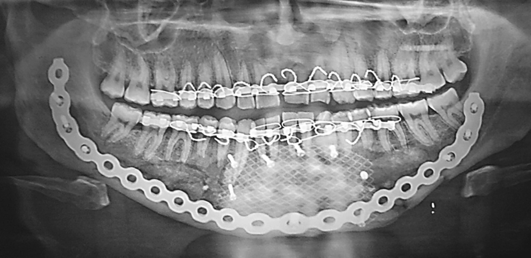 En el caso que describimos, además de la fijación rígida, también se utilizó una malla de titanio, siendo una buena alternativa para las FMC por la estabilidad tridimensional que provee y su adaptabilidad al contorno mandibular. Los orificios de la malla, asimismo, garantizan un suministro sanguíneo al hueso y los tejidos blandos subyacentes.15-17