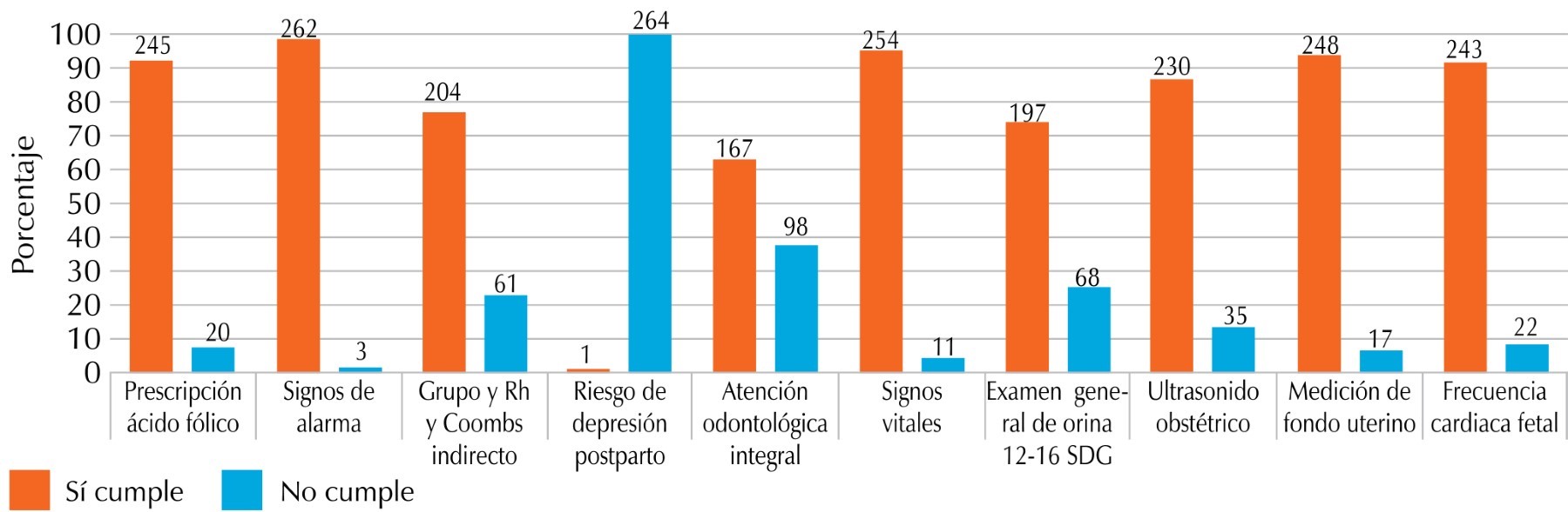 El porcentaje de cumplimiento para cada uno de los ítems clave fueron principalmente la evaluación de signos de alarma 98.86%, registro de los signos vitales 95.84%, medición del fondo uterino 93.58%, prescripción de ácido fólico 92.45%, y registro de la frecuencia cardiaca fetal 91.69%; el cumplimiento en menor medida se reflejó en la solicitud de ultrasonido obstétrico 86.79%, evaluación del grupo y Rh y Coombs indirecto 79.98%, solicitud de examen general de orina entre las semanas 12 y 16 de gestación 74.33% y atención odontológica integral 63.01%. En cuanto a la evaluación de riesgo de depresión postparto, el cumplimiento fue prácticamente nulo, reportándose sólo en 0.37% (Figura 2).