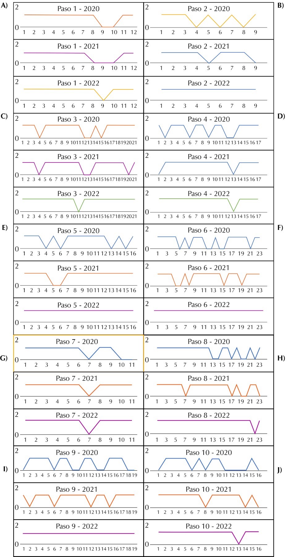Paso 10: Cuidado de la salud y nutrición materna e infantil más allá de la Institución de salud -Redes de apoyo institucionales y comunitarias. De los ítems 42.1% (8/19) no cumplieron en 2020, el ítem 10.1, el 10.6, el 10.8, el 10.11, el 10.12, el 10.13, el 10.14 y el 10.16; en 2021 18.7% (3/16) de los ítems no cumplieron; el ítem 10.8, el 10.14 y el 10.16; en 2022 6.2% (1/16) de los ítems no cumplieron el ítem 10.13 (Figura 1J).