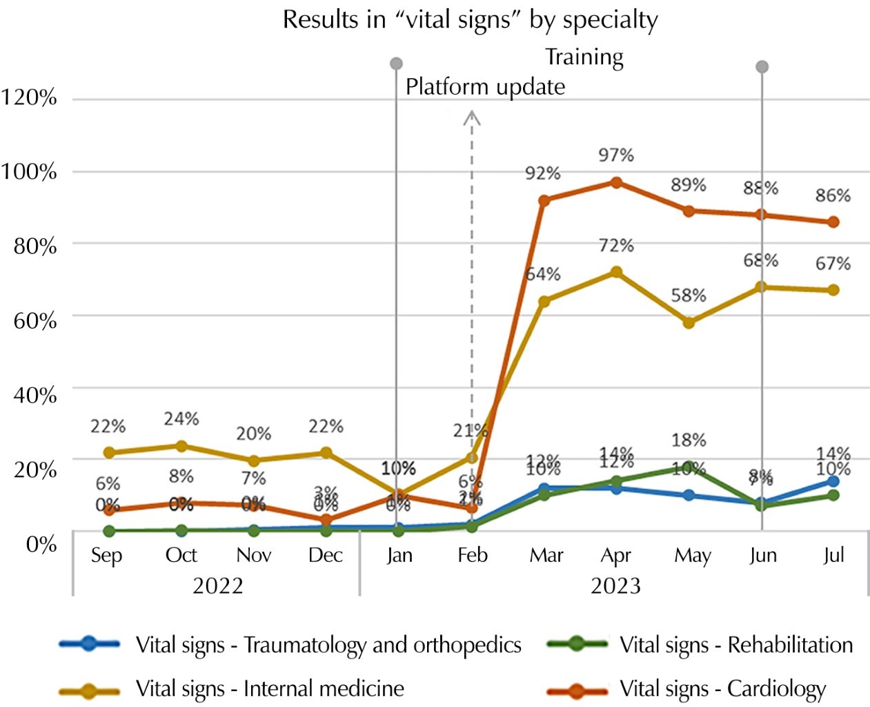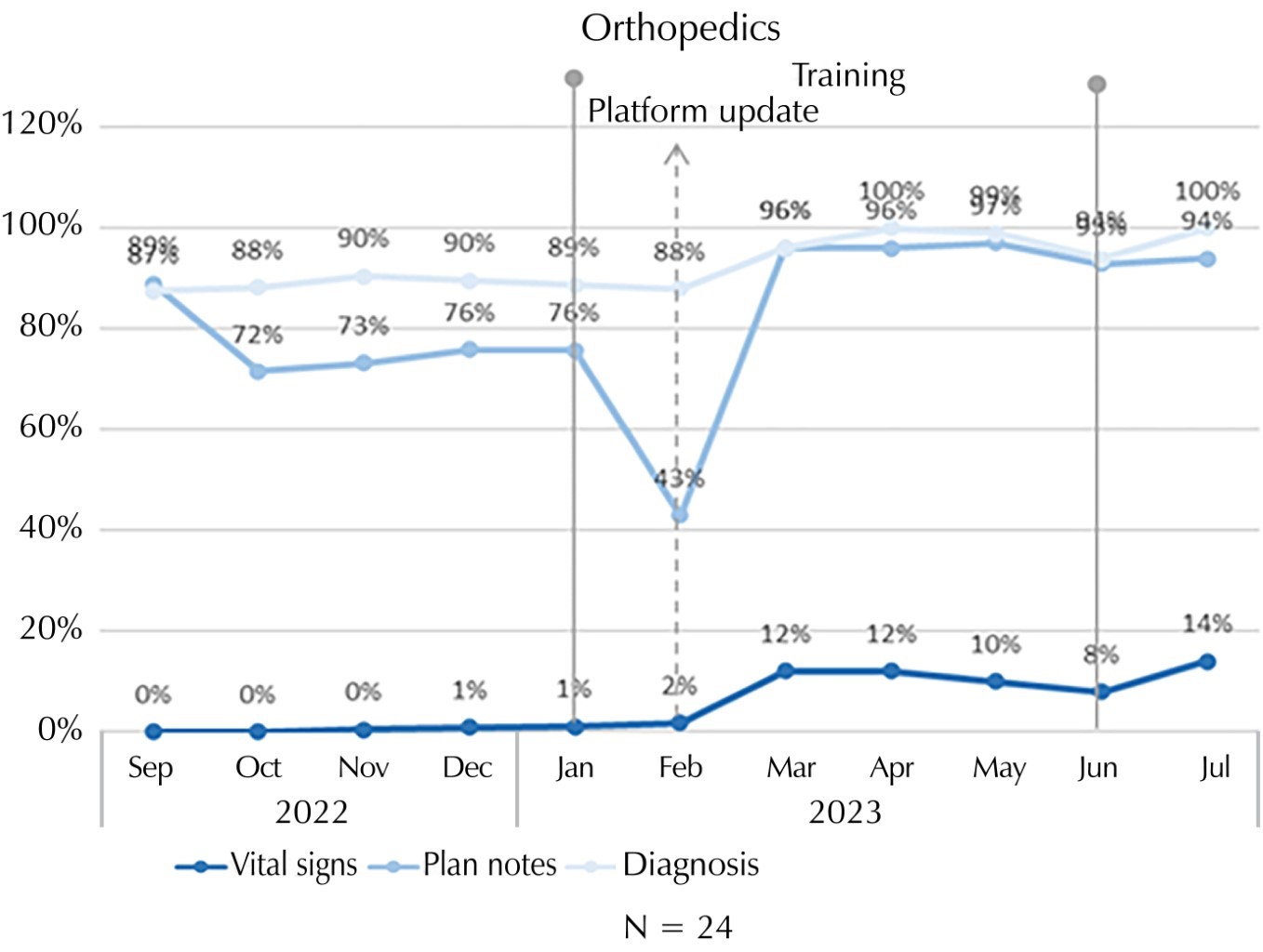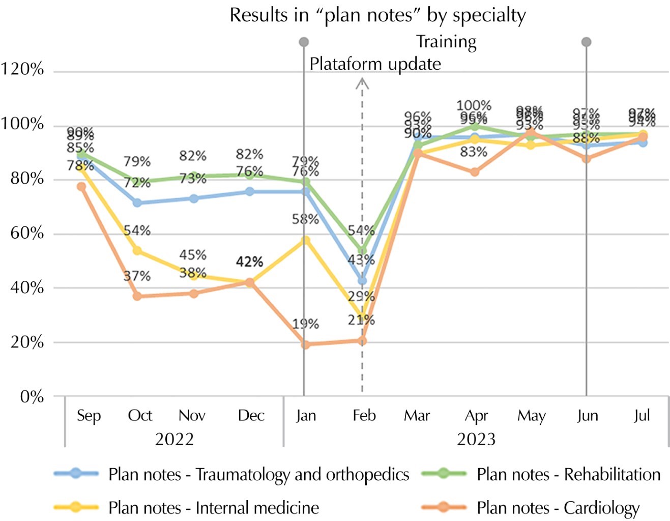 Resultados: realizamos una revisión de una cohorte de 89 médicos, durante un período de implementación de ocho meses: las especialidades incluidas en el estudio fueron urgencias, ortopedia, rehabilitación, medicina interna y cardiología. Observamos una mejoría en la utilización de los HCE después de la formación, especialmente en especialidades que dudaban en cambiar. Sin embargo, es importante señalar que la mejora en la finalización del expediente clínico no es inmediata, e incluso se produce una disminución en el uso antes de que la mejor se hiciera evidente. Este es uno de los primeros informes sobre la implementación de HCE en nuestro hospital.