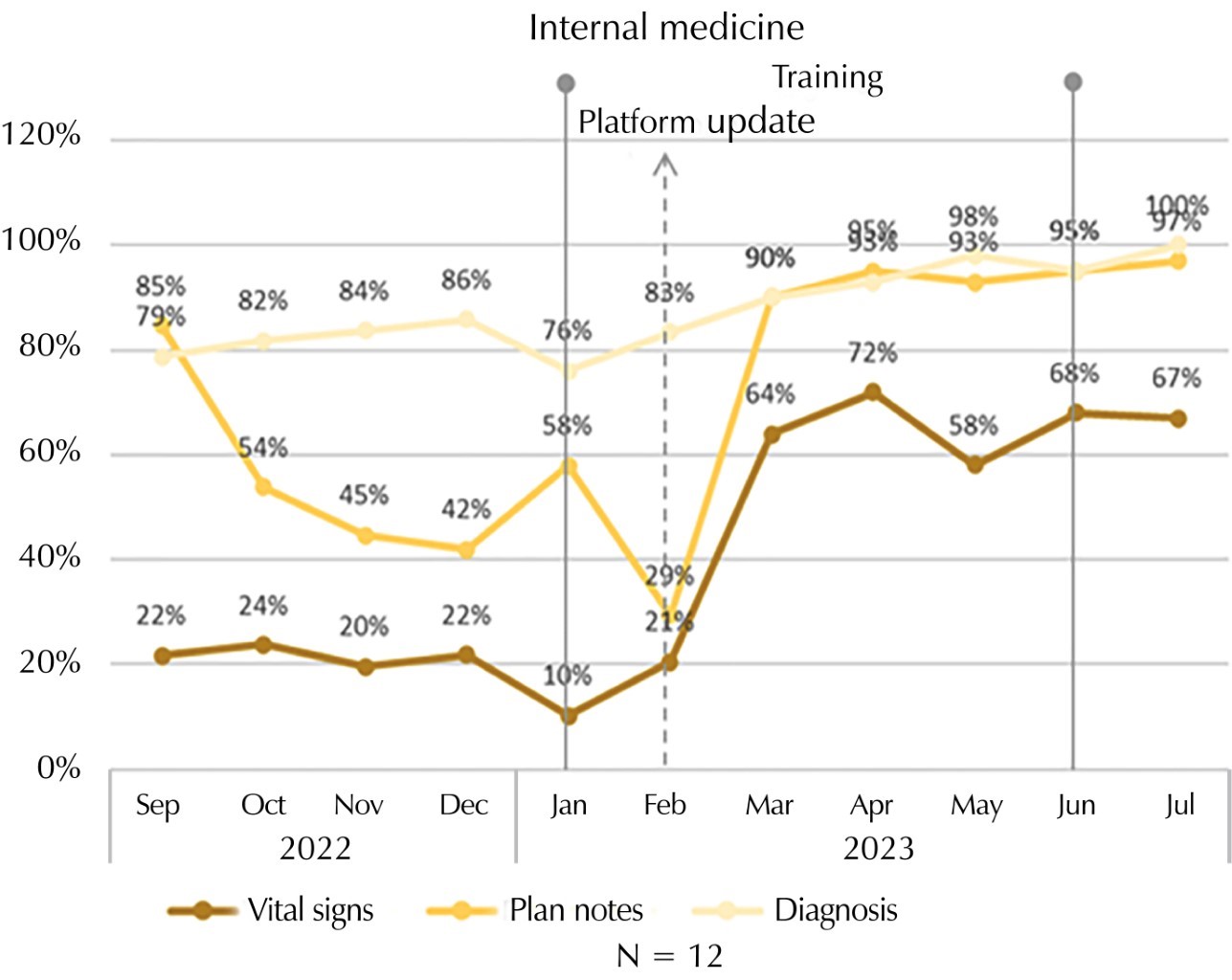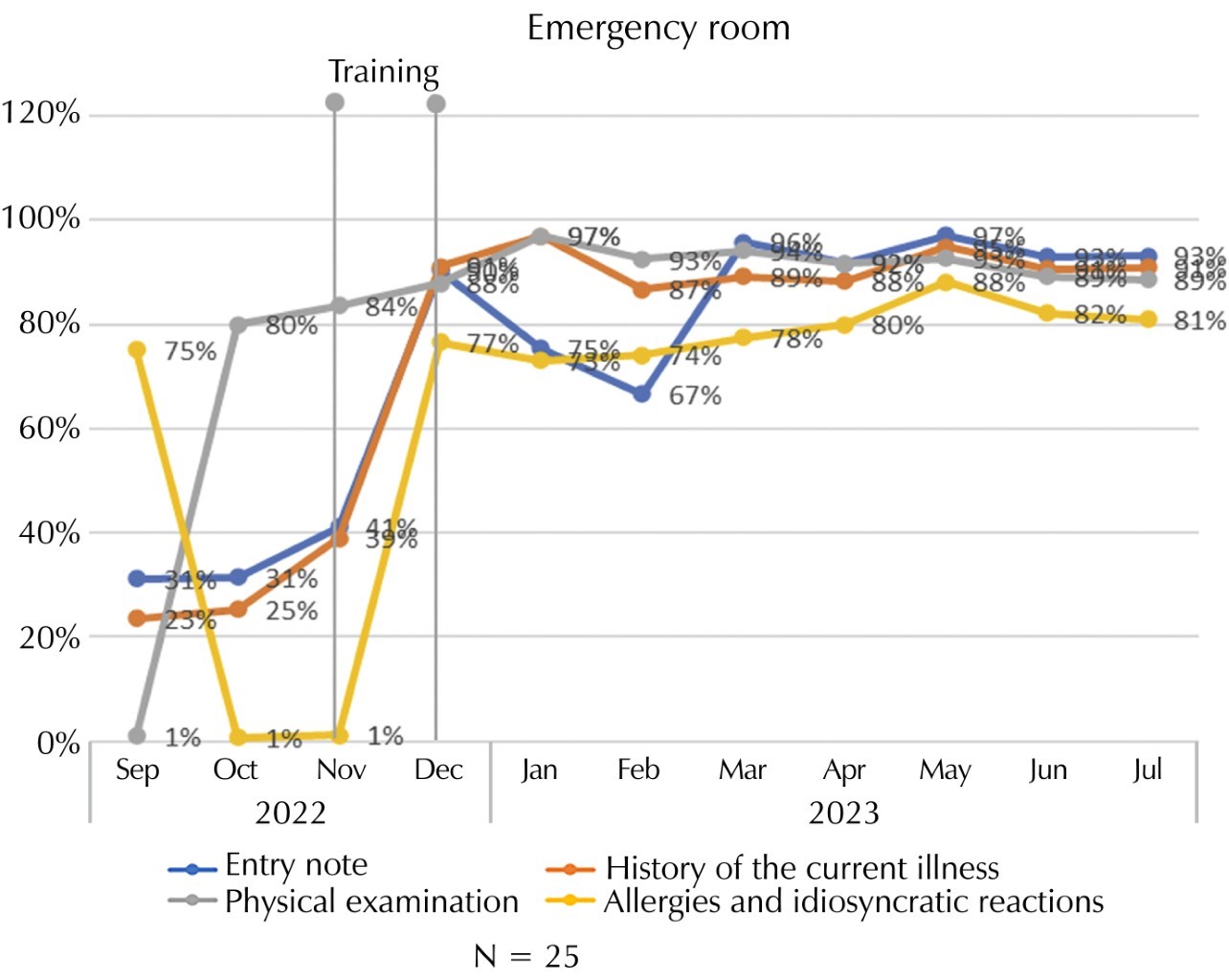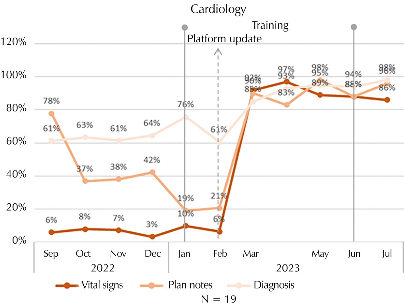 Resultados: realizamos una revisión de una cohorte de 89 médicos, durante un período de implementación de ocho meses: las especialidades incluidas en el estudio fueron urgencias, ortopedia, rehabilitación, medicina interna y cardiología. Observamos una mejoría en la utilización de los HCE después de la formación, especialmente en especialidades que dudaban en cambiar. Sin embargo, es importante señalar que la mejora en la finalización del expediente clínico no es inmediata, e incluso se produce una disminución en el uso antes de que la mejor se hiciera evidente. Este es uno de los primeros informes sobre la implementación de HCE en nuestro hospital.