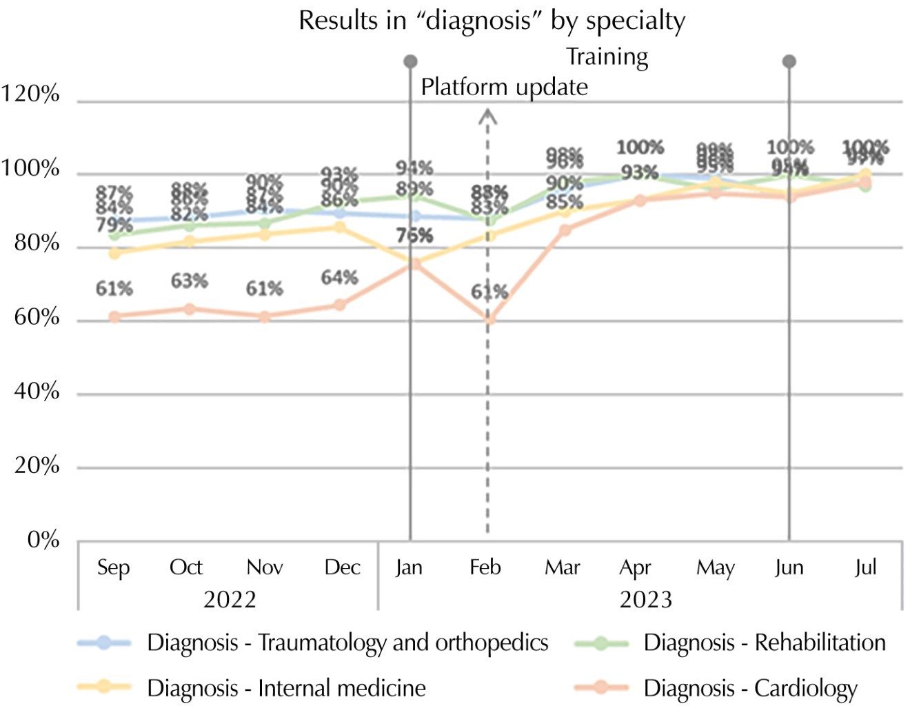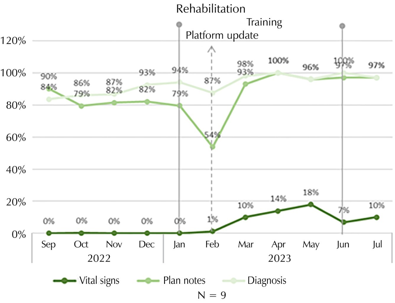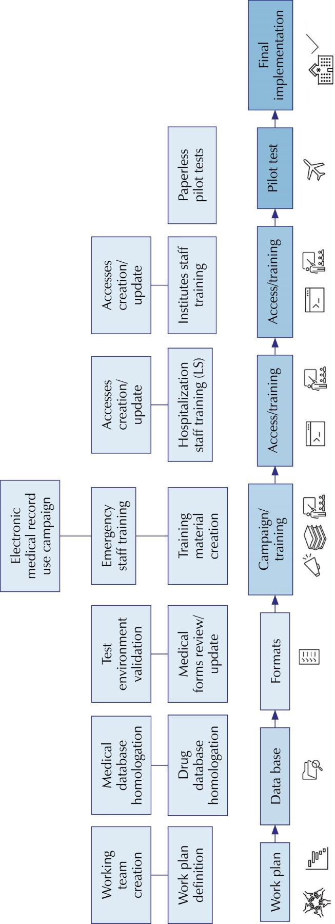 Conclusión: la implementación efectiva conlleva una serie de cambios constantes que involucran la opinión médica, algunas especialidades requieren más datos en la HCE, lo que aumenta la complejidad de su uso. La formación y la retroalimentación son puntos clave para el éxito. Nuestro sistema de implementación es un ejemplo de cómo introducir un sistema y pueda ser replicado por cualquier institución de salud que necesite una transformación digital.