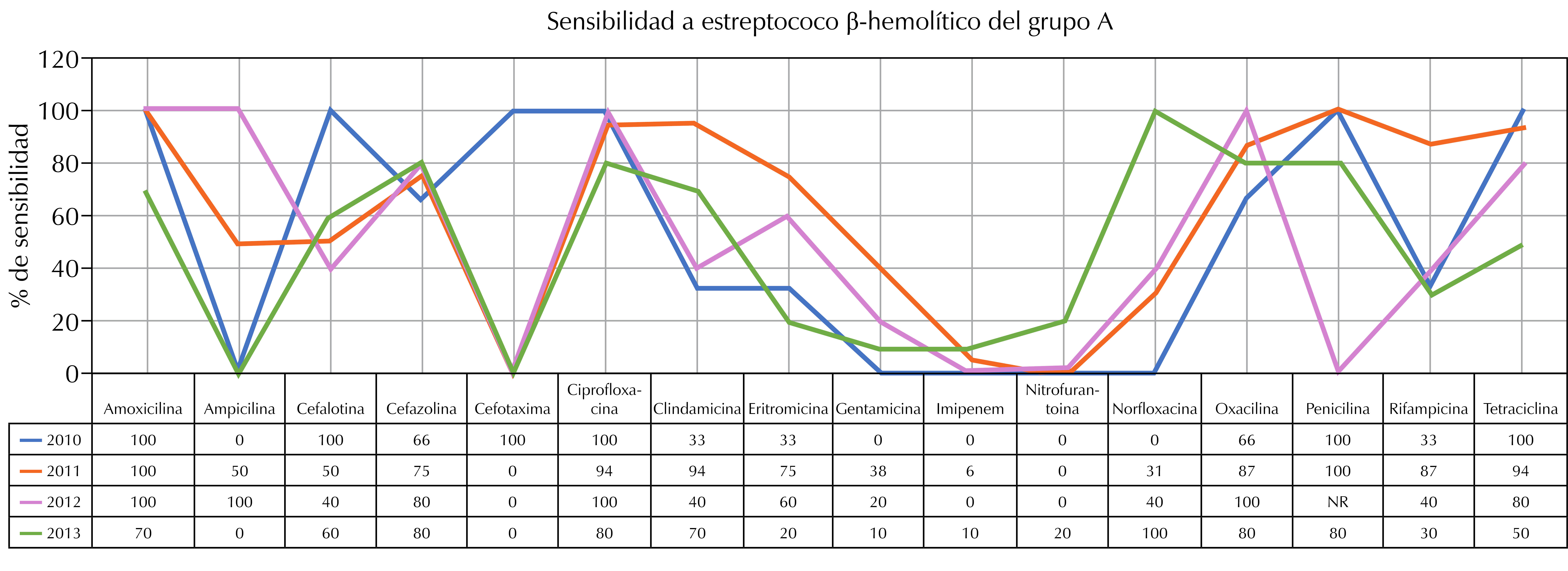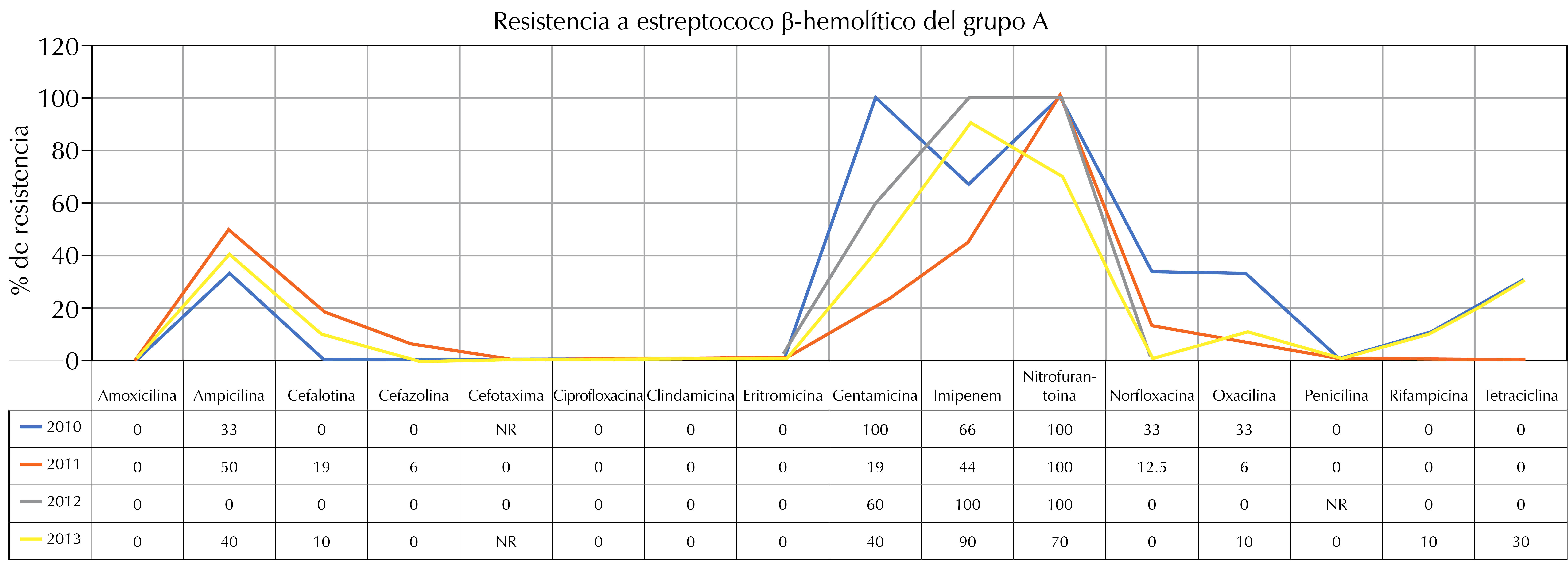 Resistencia a estreptococo β-hemolítico del grupo A en el periodo comprendido entre 2010 a 2013 fue para amoxicilina 0, 0, 0 y 0%; ampicilina 33, 50, 0 y 40%; cefalotina 0, 19, 0 y 10%; cefazolina 0, 6, 0 y 0%; los demás datos se muestran en la Figura 2.