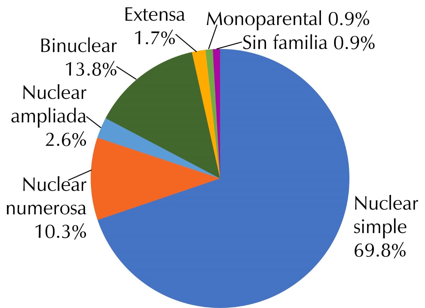 La población total estudiada fue de 116 usuarios de VSB, cifra similar a otros estudios sobre tipología familiar realizados en Colombia y en México.9,11 Los porcentajes más altos en la distribución de la población total resultaron dentro de los cuatro subtipos de la familia nuclear, lo cual es consistente con lo establecido en el 2018 en la Encuesta Nacional de Ingresos y Gastos de los Hogares (ENIGH), donde, de los 34,744,818 hogares en México, 71.3%. se componía de familias nucleares.15 Sin embargo, una característica relevante de nuestra herramienta de estudio es que nos permitió diferenciar a cada subtipo de la familia nuclear, siendo la familia nuclear simple la más prevalente, con un 69.8%.