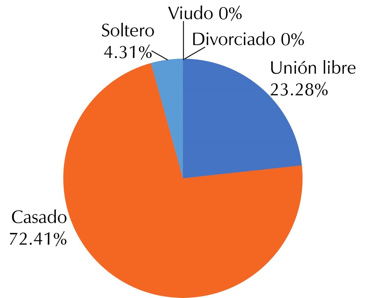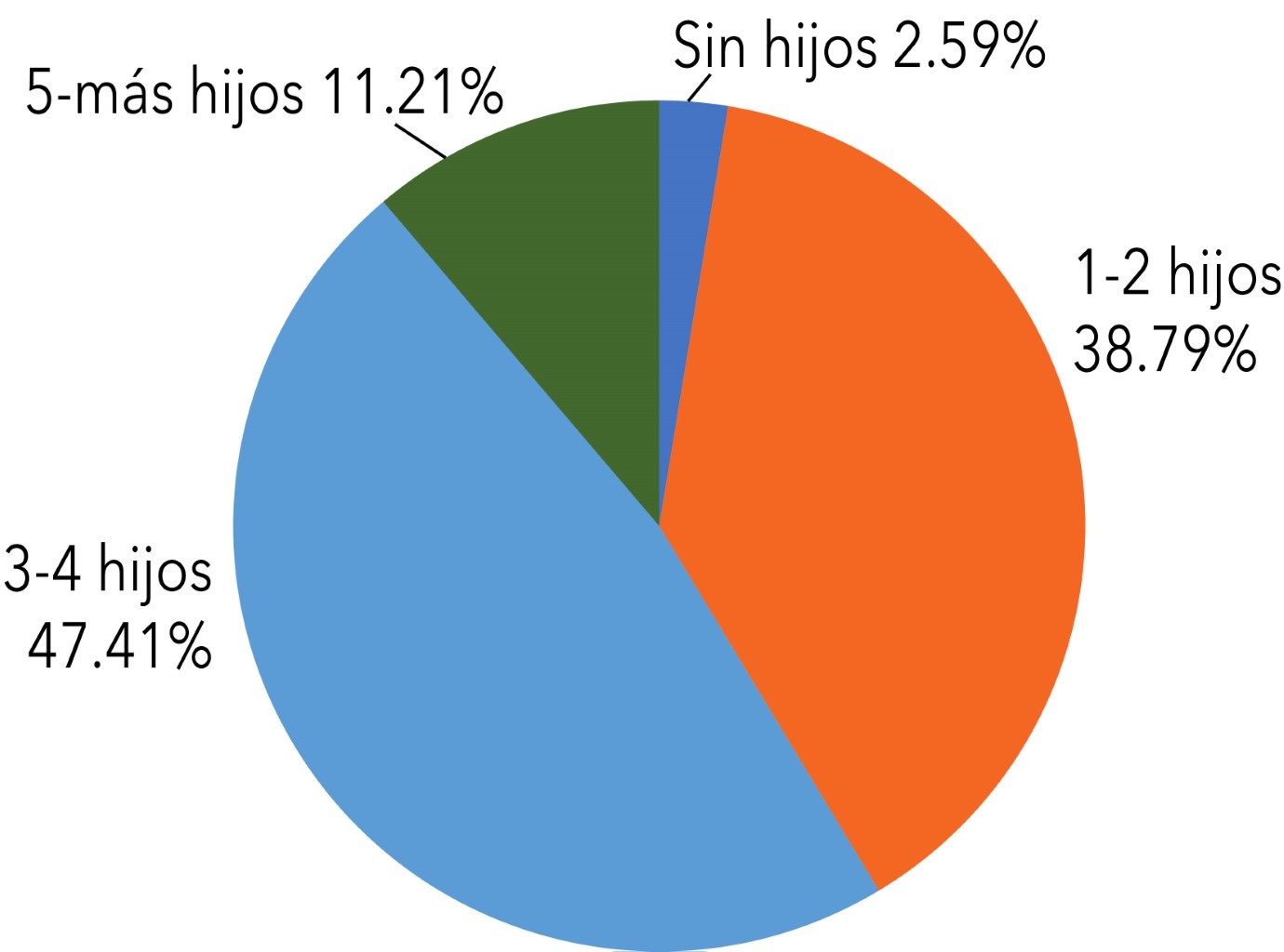 En la Figura 1 se observa la distribución de la tipología familiar, donde destaca que la familia nuclear simple constituye la mayor proporción de los usuarios de VSB. La Figura 2 muestra la concentración de edades entre los 30 y 39 años, rango predominante en esta población. En la Figura 3, el estado civil casado es claramente el más frecuente, mientras que la Figura 4 evidencia que la escolaridad secundaria es la más común entre los participantes. Finalmente, la Figura 5 demuestra que la mayoría de los usuarios tiene entre tres y cuatro hijos biológicos, seguido del grupo con uno a dos hijos, lo que complementa el perfil demográfico característico de esta población.