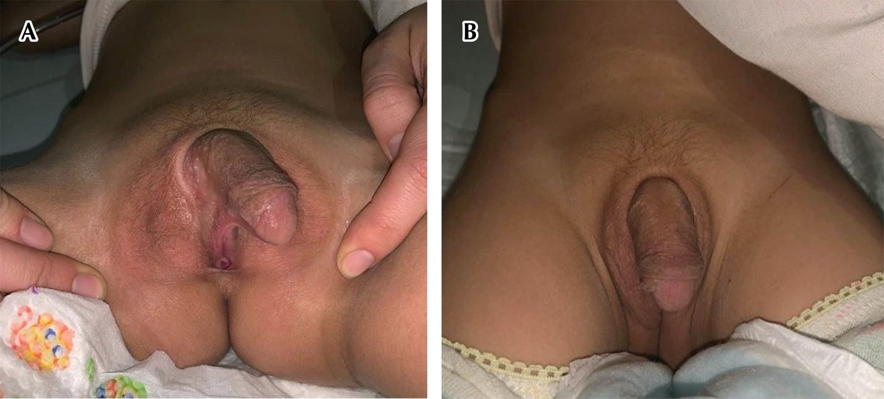 Durante la exploración física de su ingreso se encontraron genitales ambiguos Prader 5, introito vaginal visible, vello púbico presente (Figura 1 y 2) y signos de deshidratación, por lo que se le indicó solución mixta (880 ml para 24 horas) e hidrocortisona iniciando con dosis de estrés 60 mg/m2/día por probable crisis adrenal, se tomaron laboratoriales reportando niveles de Na 123 mmol/l, Ca 10.1 mg/dl, Cl 89.6 mmol/l, K 5.36 mmol/l, Mg 2.41 mg/dl.