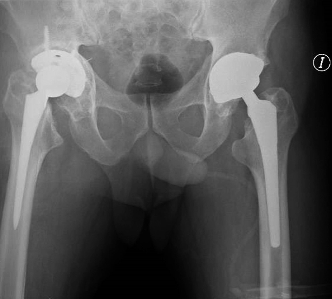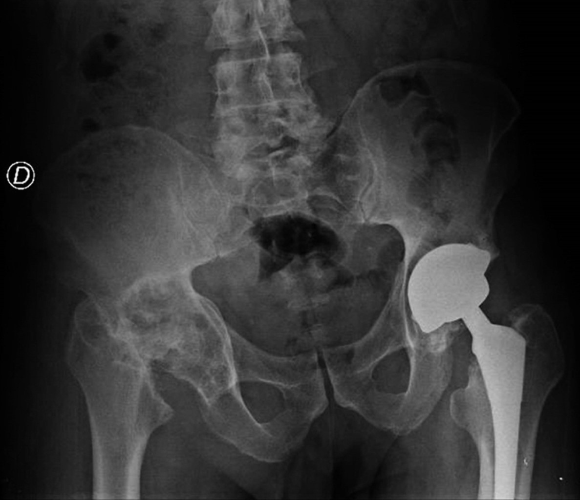 Paciente masculino de 54 años que cuenta con antecedente de artroplastía total de cadera izquierda 13 años atrás por necrosis avascular secundaria a alcoholismo, la cual cursa sin complicaciones hasta la actualidad. El paciente refiere inicio de padecimiento actual con dolor a nivel de pliegue inguinal derecho, de 10 años de evolución, de intensidad 9/10 en la escala visual analógica (EVA), que se ha tornado progresivo, que se exacerba a la movilización y la deambulación y se atenúa con el reposo, actualmente considerado incapacitante, requiriendo uso de bastón monopodal como auxiliar de la marcha y refiriendo claudicación.