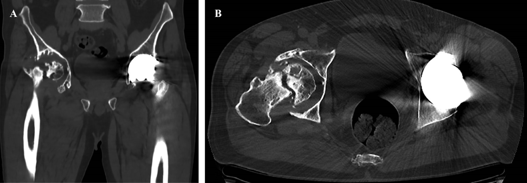 Se realiza radiografía anteroposterior (AP) de pelvis donde se observa pérdida de la esfericidad de la cabeza femoral, presencia de osteofitos, esclerosis con colapso subcondral, disminución del espacio articular, todo compatible con cambios degenerativos avanzados que se acompañan de cambios acetabulares secundarios a la osteonecrosis. En la cadera izquierda se observan componentes protésicos acetabular y femoral adecuadamente colocados y orientados, sin datos de interfaz, lisis o aflojamiento (Figura 1). Para identificar adecuadamente la morfología femoral y acetabular, se toma tomografía computarizada donde se aprecian múltiples quistes subcondrales, así como defecto óseo contenido, con pérdida considerable de hueso esponjoso principalmente de la pared posterior (Figura 2).