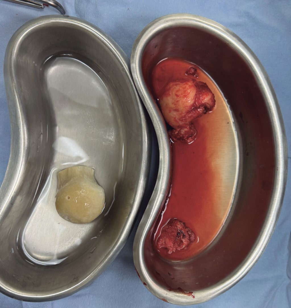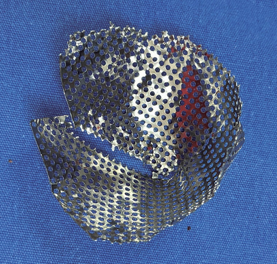 Se decidió llevar a cabo tratamiento quirúrgico que consistió en colocación de malla de titanio (Figura 3), la cual se fijó con dos tornillos de 1.5 × 1.0 cm para cubrir defecto acetabular, además de impactación de autoinjerto y aloinjerto cadavérico (ambos de cabeza femoral) (Figura 4) más colocación de artroplastía total de cadera derecha con componentes acetabular y femoral no cementados.