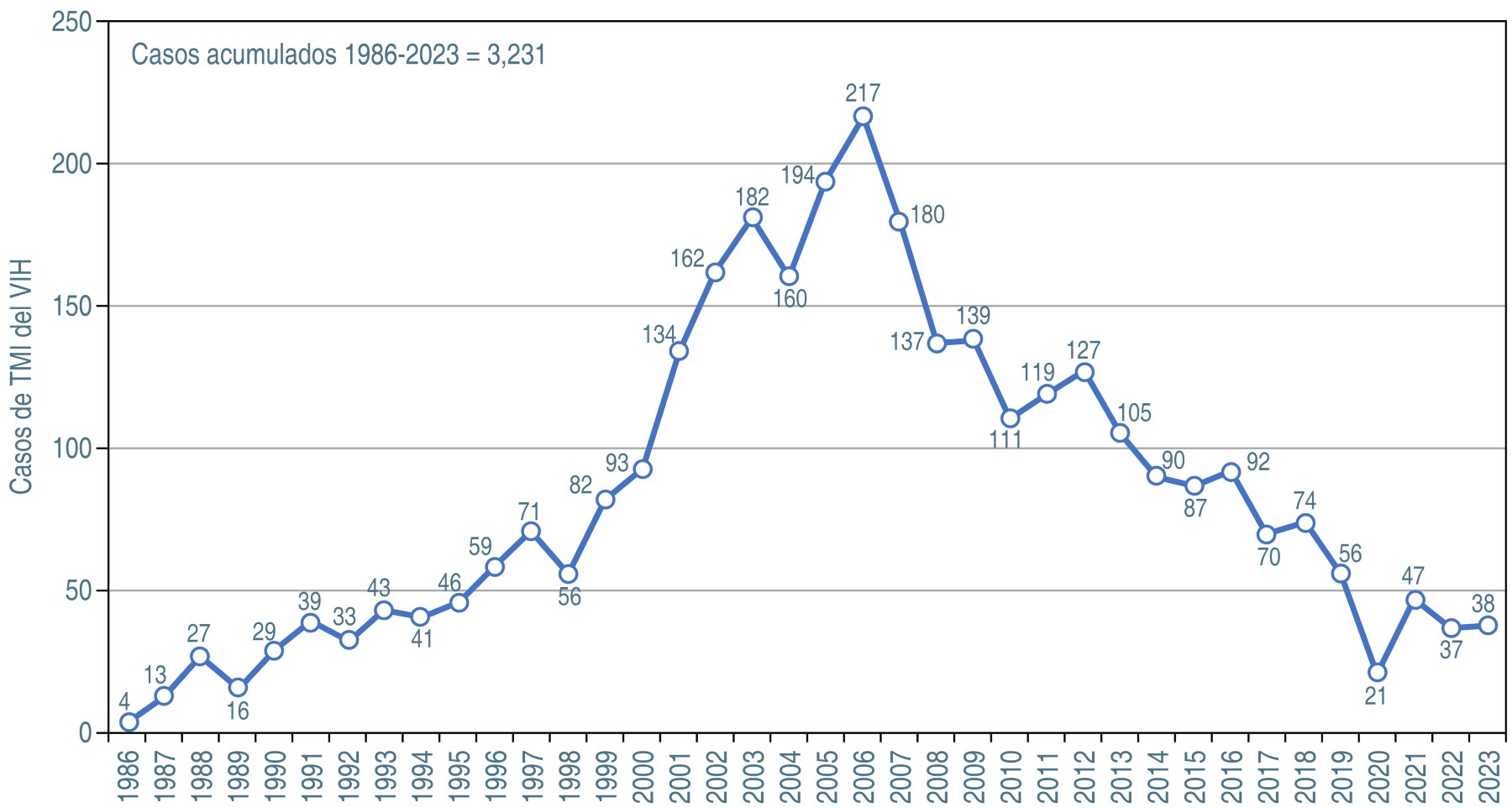 Entre 1986 y 2023 se notificaron 3,231 casos de TMI del VIH en población sin seguridad social en México, lo que representa 80% del total nacional. A partir de 1986, la tendencia fue ascendente hasta 2006, cuando se alcanzó el pico con 217 casos. Posteriormente, se observó un descenso sostenido con variaciones interanuales. En 2018 se reportaron 74 casos (-65.8% respecto a 2006), mientras que entre 2019 y 2023 se mantuvieron niveles bajos: el mínimo histórico fue en 2021 (21 casos), seguido por un repunte de 38 casos en 2023 (Figura 4).