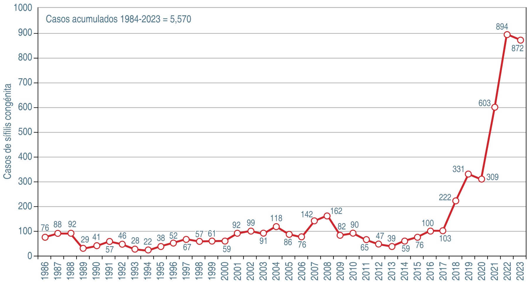 Para sífilis congénita, en el periodo de 1986 a 2023, se notificaron 5,570 casos, lo que representa 90% del total de casos reportados. Como se muestra en la Figura 5, hubo diferencias importantes; por ejemplo, entre 1986 y 2008 los casos anuales oscilaron entre 29 y 162, mientras que entre 2009 y 2015 se mantuvieron por debajo de 100 casos anuales. De manera preocupante, a partir de este año hubo incremento significativo, ya que, de 75 casos reportados en el 2016, se incrementó a 222 en el 2018 y a 331 en el 2019, 603 casos en 2020, 894 en 2021 (máximo histórico) y 872 en 2023. Esto representa un aumento acumulado de más de 800%, en menos de una década.