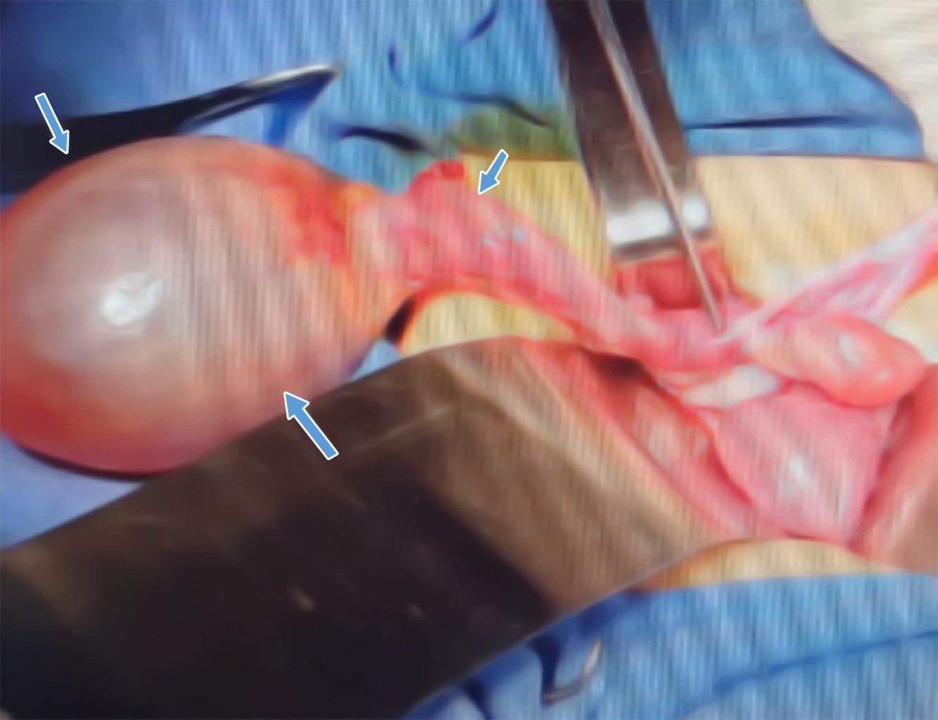 Se programó para laparotomía exploradora, encontrando quiste de ovario izquierdo con su fimbria edematizada (Figura 2). El útero, ovario derecho y su trompa de Falopio normales.