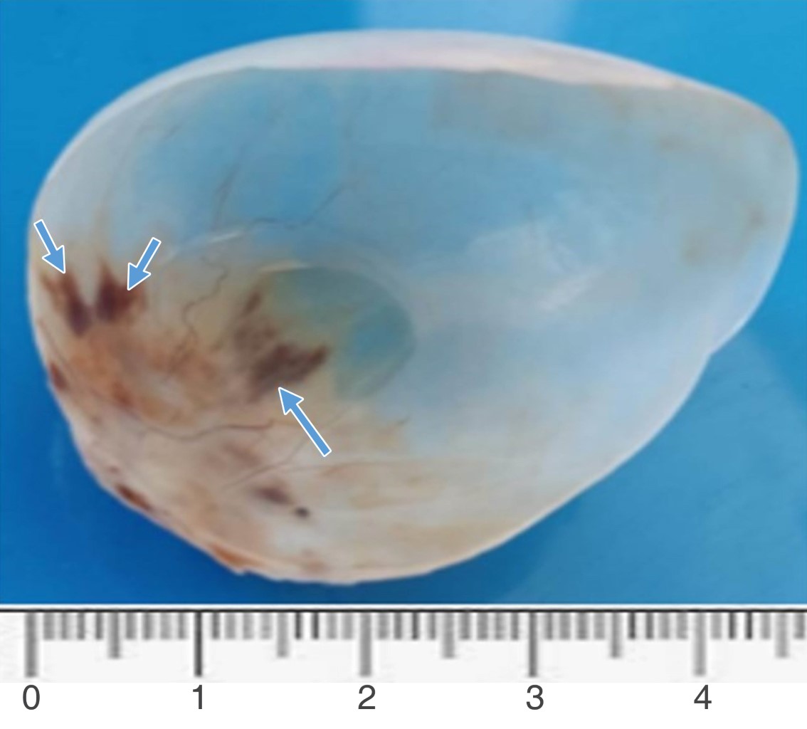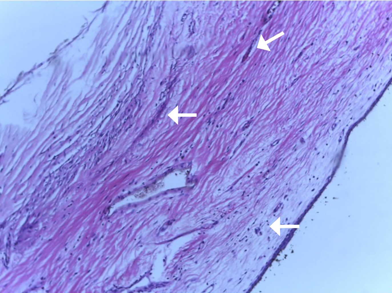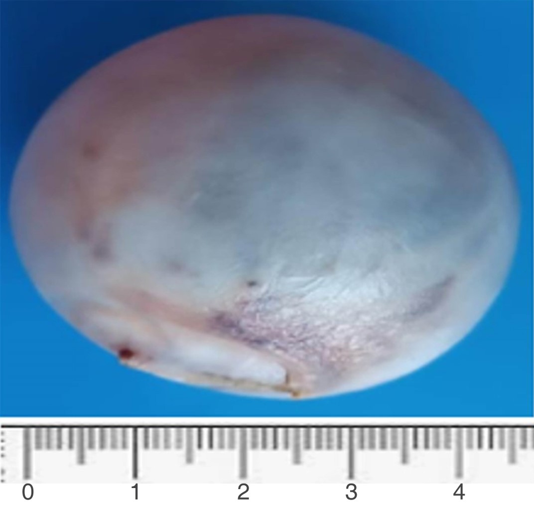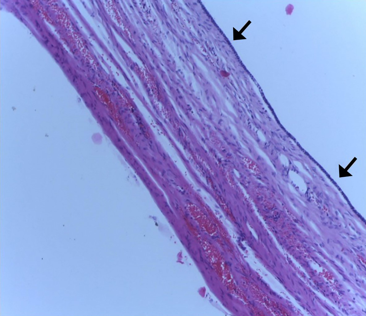 En el reporte del estudio histopatológico se describe de la siguiente manera: tumor de ovario izquierdo, mide 4.8 × 4 × 2.3 cm, de forma ovoide, con aspecto quístico, cápsula íntegra, superficie externa lisa, transparente, de color blanco grisáceo. Al corte, se encuentra lleno de líquido transparente, la superficie de la cavidad tumoral es lisa, color blanco, la pared mide menos de 1 mm de espesor, la consistencia del tejido es suave (Figuras 3 y 4). A la revisión microscópica, con tinción de hematoxilina/eosina se observó pared de tumor quístico formada por corteza de ovario, zona de hemorragia, presencia de macrófagos con pigmento compatible con hemosiderina y células gigantes tipo cuerpo extraño (Figura 5). La cara interna del quiste formada por epitelio cúbico simple sin atipias (Figura 6). Con todo lo anterior, se integró el diagnóstico de cistoadenoma congénito.