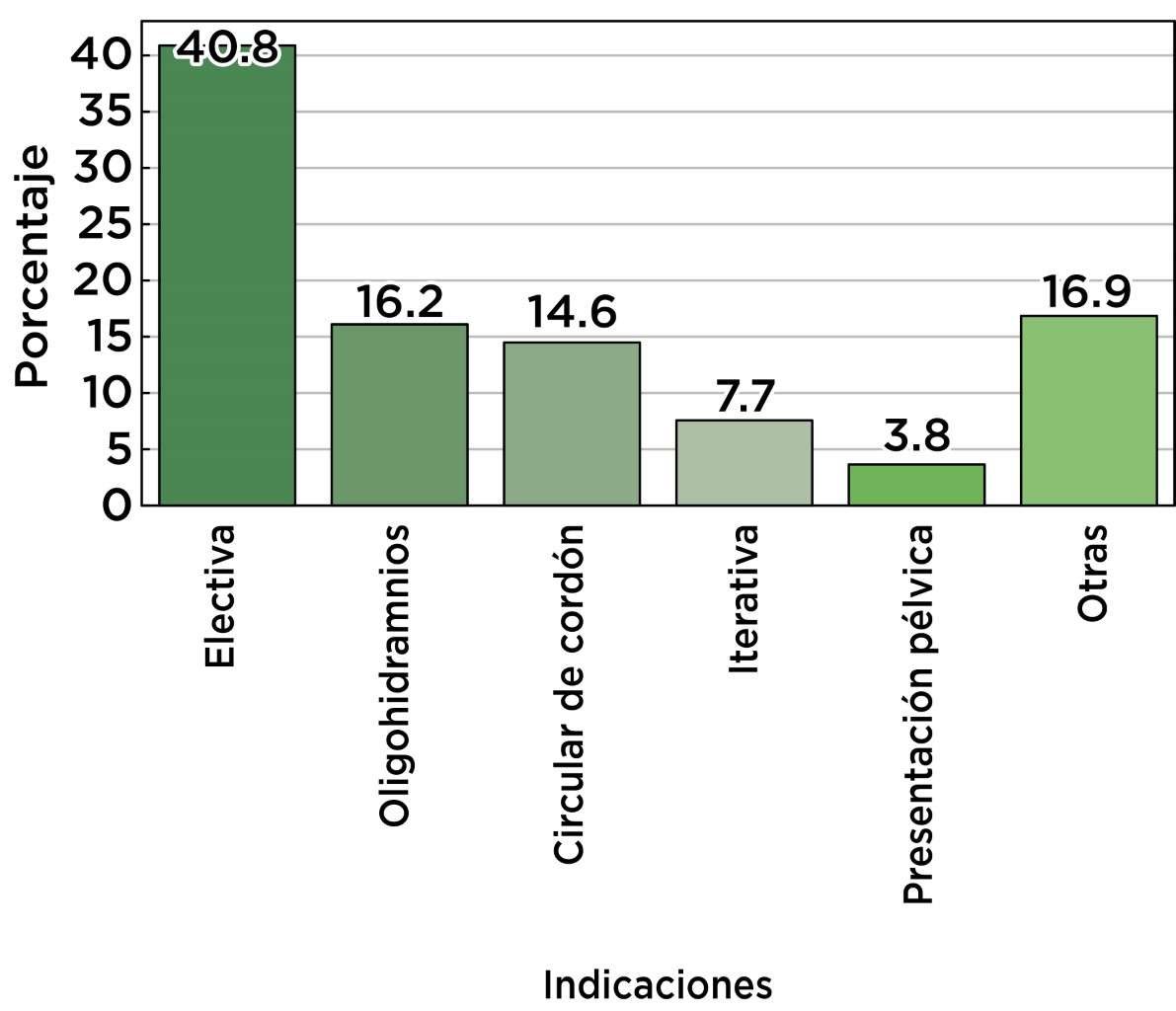 Indicaciones principales: institución privada: cesárea electiva (40.8%), oligohidramnios (16.2%), circular de cordón (14.6%), iterativa (7.7%). Institución pública: riesgo de pérdida de bienestar fetal (34.6%), falta de progresión de trabajo de parto (10%), ruptura prematura de membranas (9.2%), oligohidramnios (8.5%) (Figuras 1 y 2).
