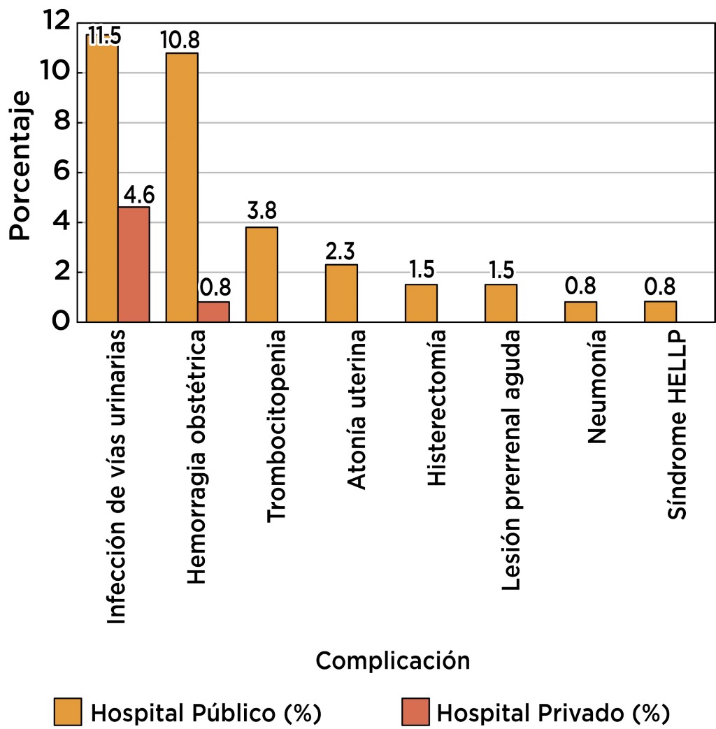 Complicaciones: hospital privado: infecciones de vías urinarias (4.6%), hemorragia obstétrica (0.8%). Hospital público: infección de vías urinarias (11.5%), hemorragia obstétrica (10.8%), trombocitopenia (3.8%), atonía uterina (2.3%), histerectomía (1.5%), lesión prerrenal aguda (1.5%), neumonía y síndrome HELLP (0.8% cada una) (Figura 3).