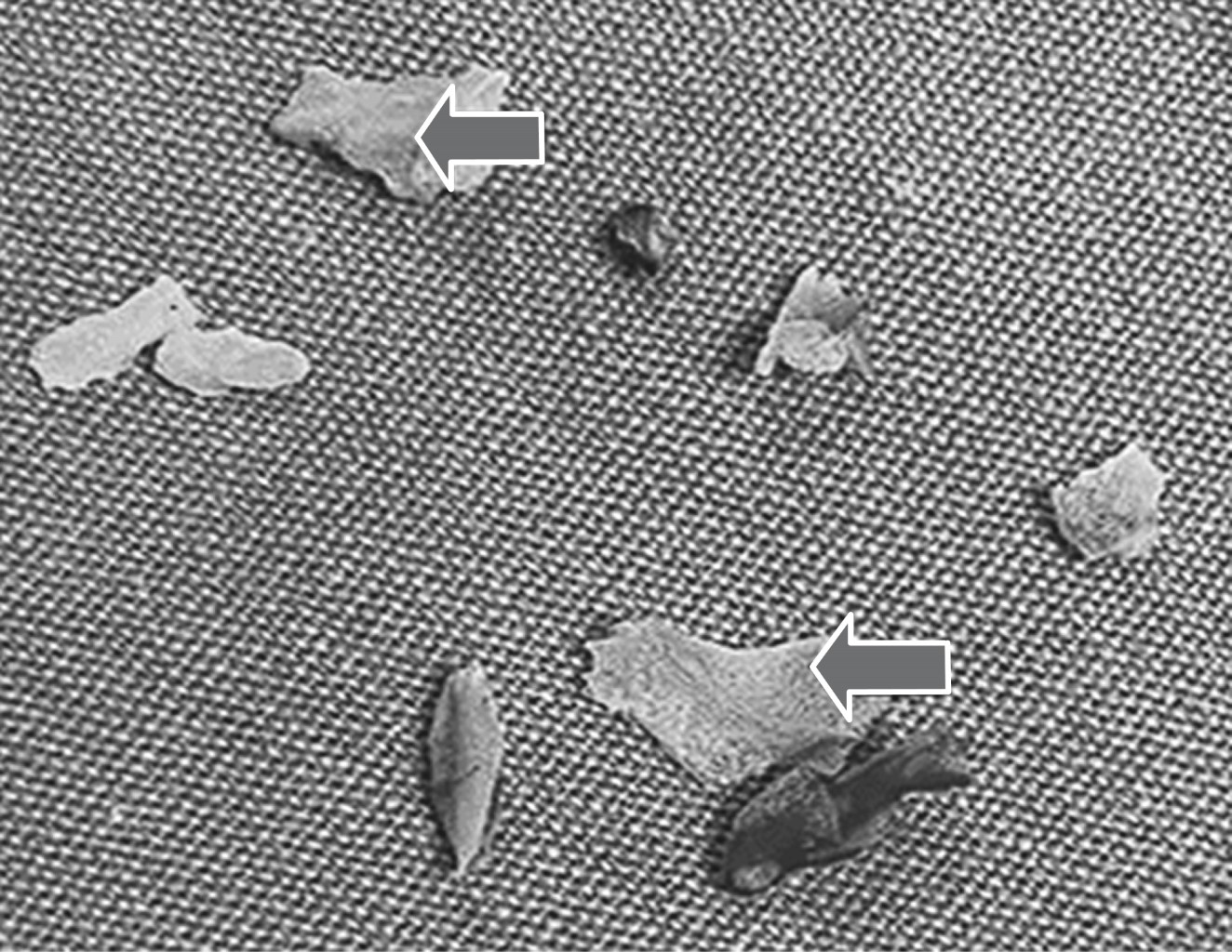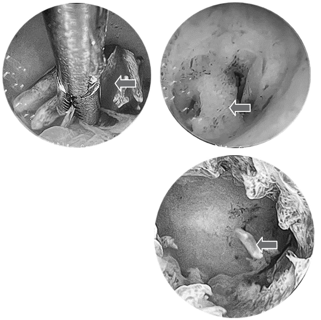 Ante ello, se decidió efectuar una histeroscopia diagnóstica, que dejó ver una cavidad uterina con evidencia de ostiums y recesos libres (Figura 1). No se identificó un DIU, pero se observaron múltiples fragmentos de consistencia dura y color blanquecino de distintas dimensiones (el mayor de 0.5 cm; el menor de 0.2 cm), los cuales fueron extraídos con pinzas histeroscópicas Grasper para dejar limpia la cavidad uterina (Figura 2). El reporte histopatológico registró varios fragmentos de tejido que, en conjunto, midieron 10 × 5 × 5 mm; también se identificaron trabéculas de hueso bien formadas, sin componentes celulares de médula ósea y con diagnóstico de metaplasia ósea.