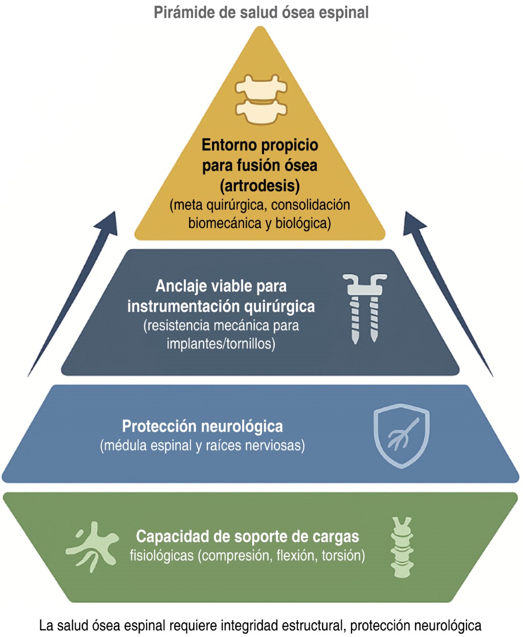 La salud ósea espinal se define como la capacidad integral de cada vértebra para soportar las cargas fisiológicas complejas (compresión axial, flexión, torsión) para proteger a la médula espinal y las raíces nerviosas y para servir como un anclaje biológico y mecánico viable para la instrumentación quirúrgica y promover un entorno propicio para la fusión ósea (artrodesis).