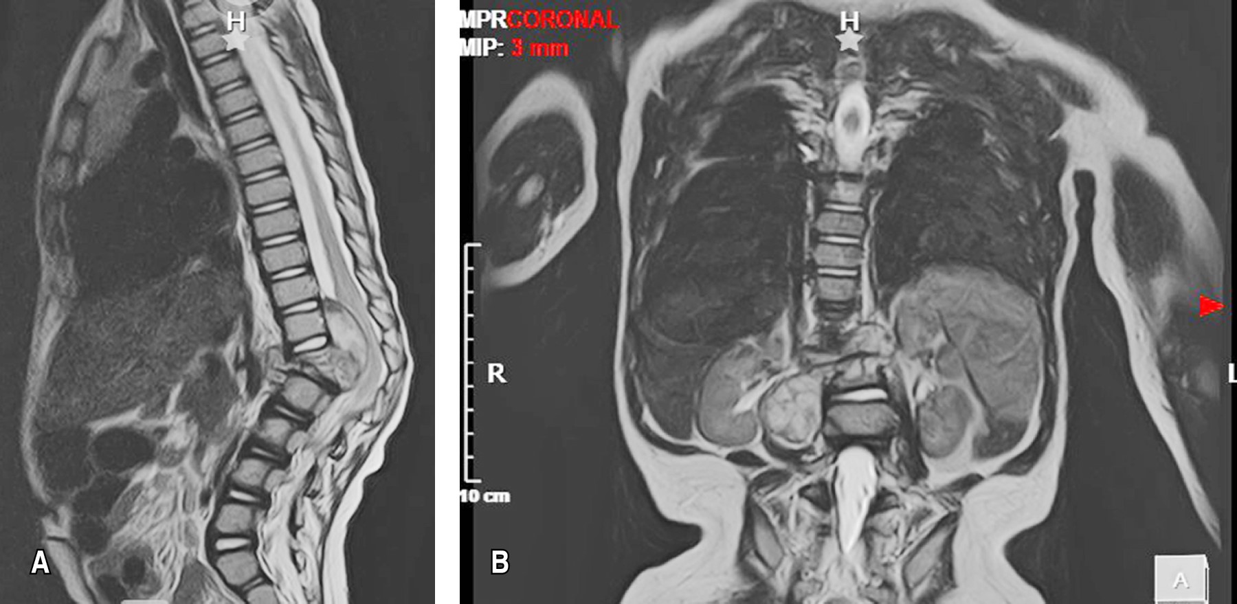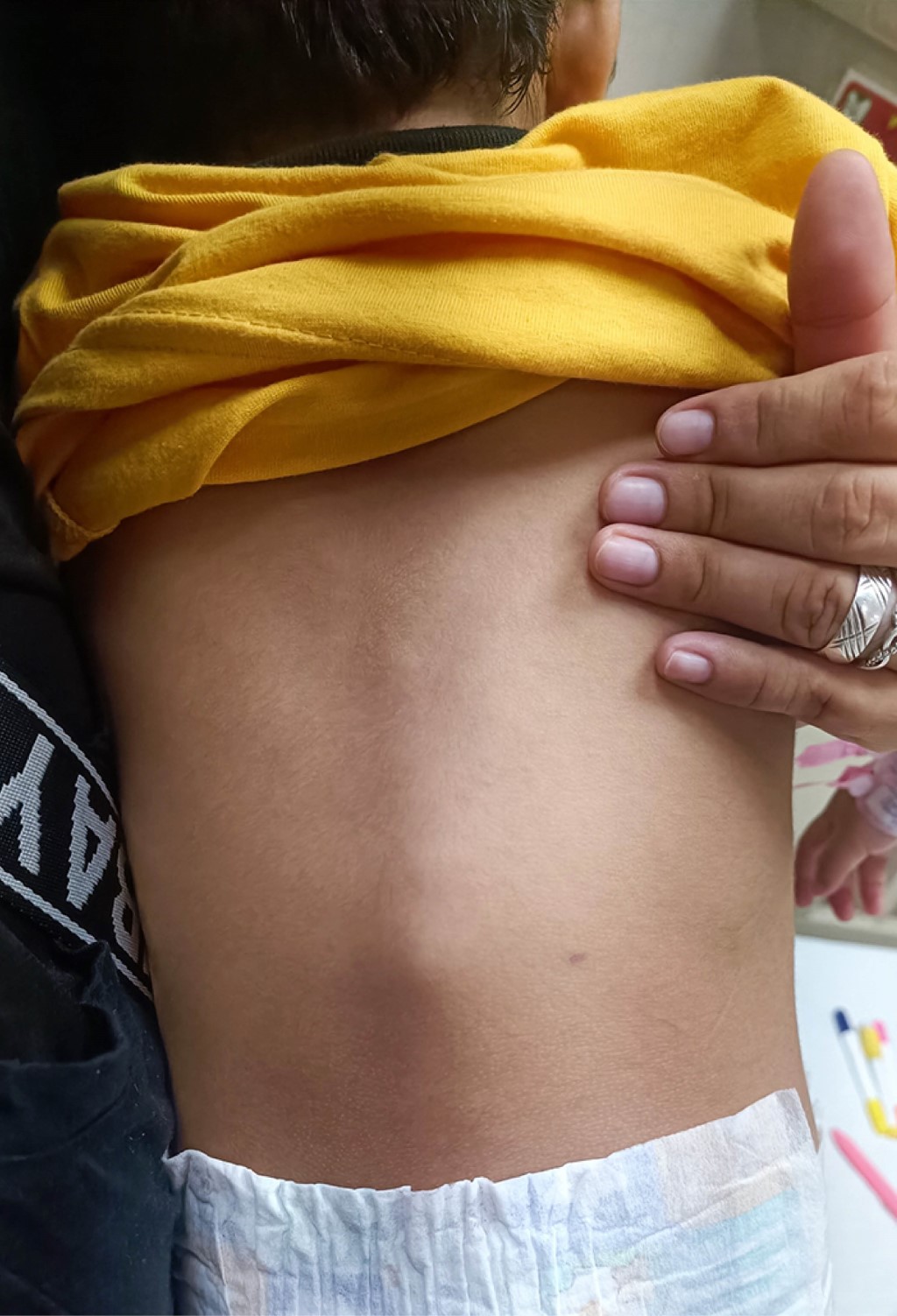 El cuadro clínico inició con síntomas inespecíficos como malestar general, irritabilidad, dolor abdominal y diarrea. Recibió tratamiento sintomático en consulta privada con una mejoría transitoria de sintomatología por una semana con antiinflamatorio no esteroideo y plan de hidratación. Posteriormente inicia recurrencia con dolor abdominal, episodios de evacuaciones diarreicas, agregando dolor axial en columna dorsolumbar, dificultad a la deambulación y aparición de una tumoración palpable dolorosa en región dorsal de aproximadamente 2 × 2 cm a nivel de T12 (Figura 1). Ante esta nueva sintomatología, el paciente fue referido a traumatología.