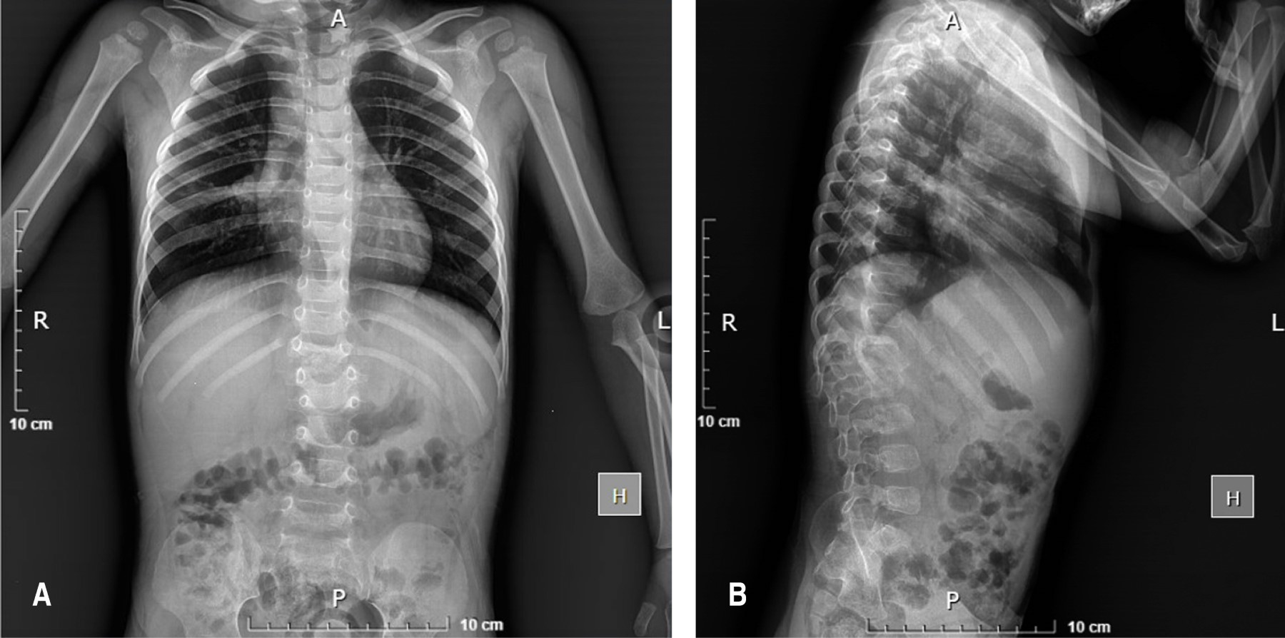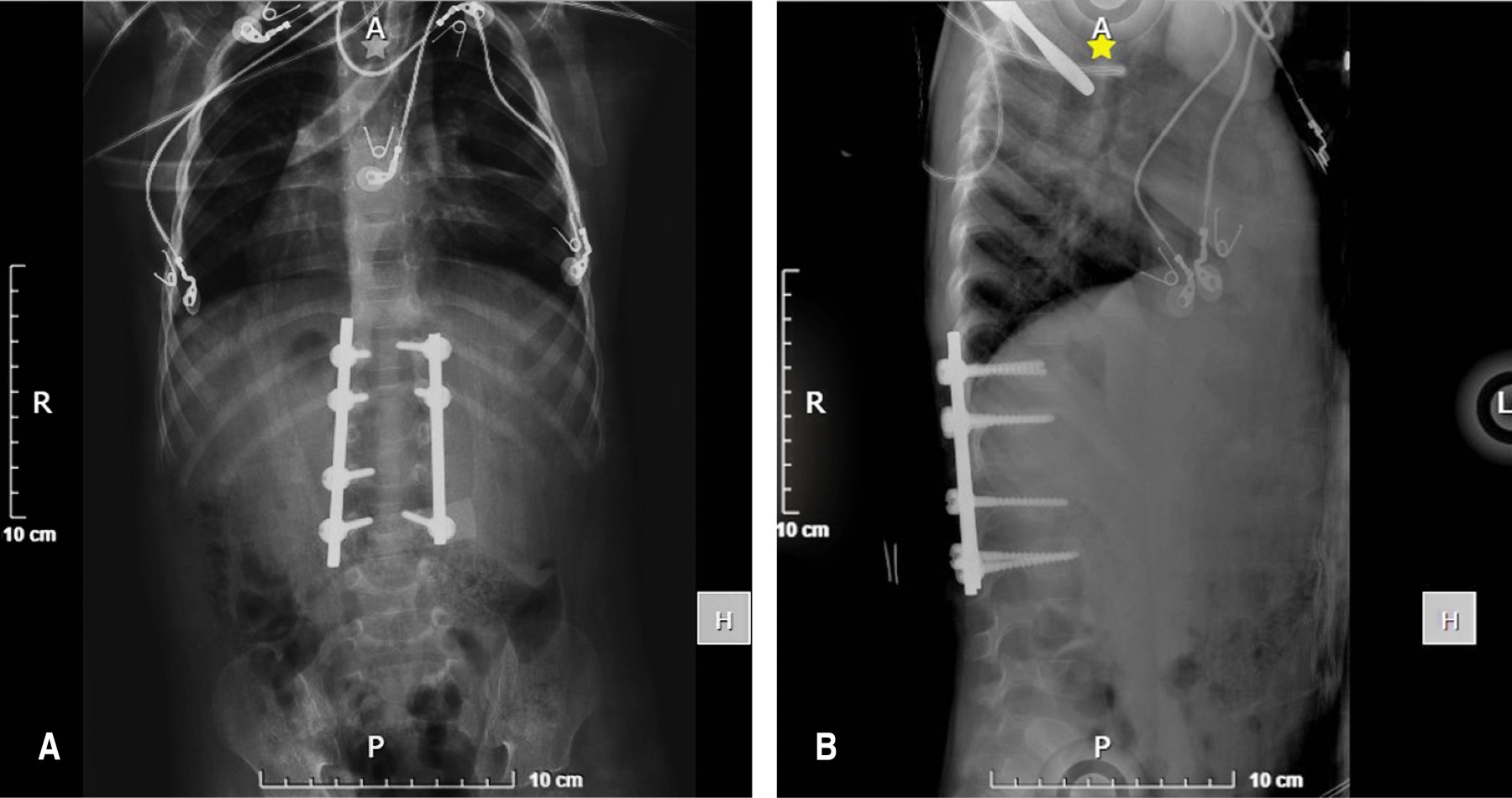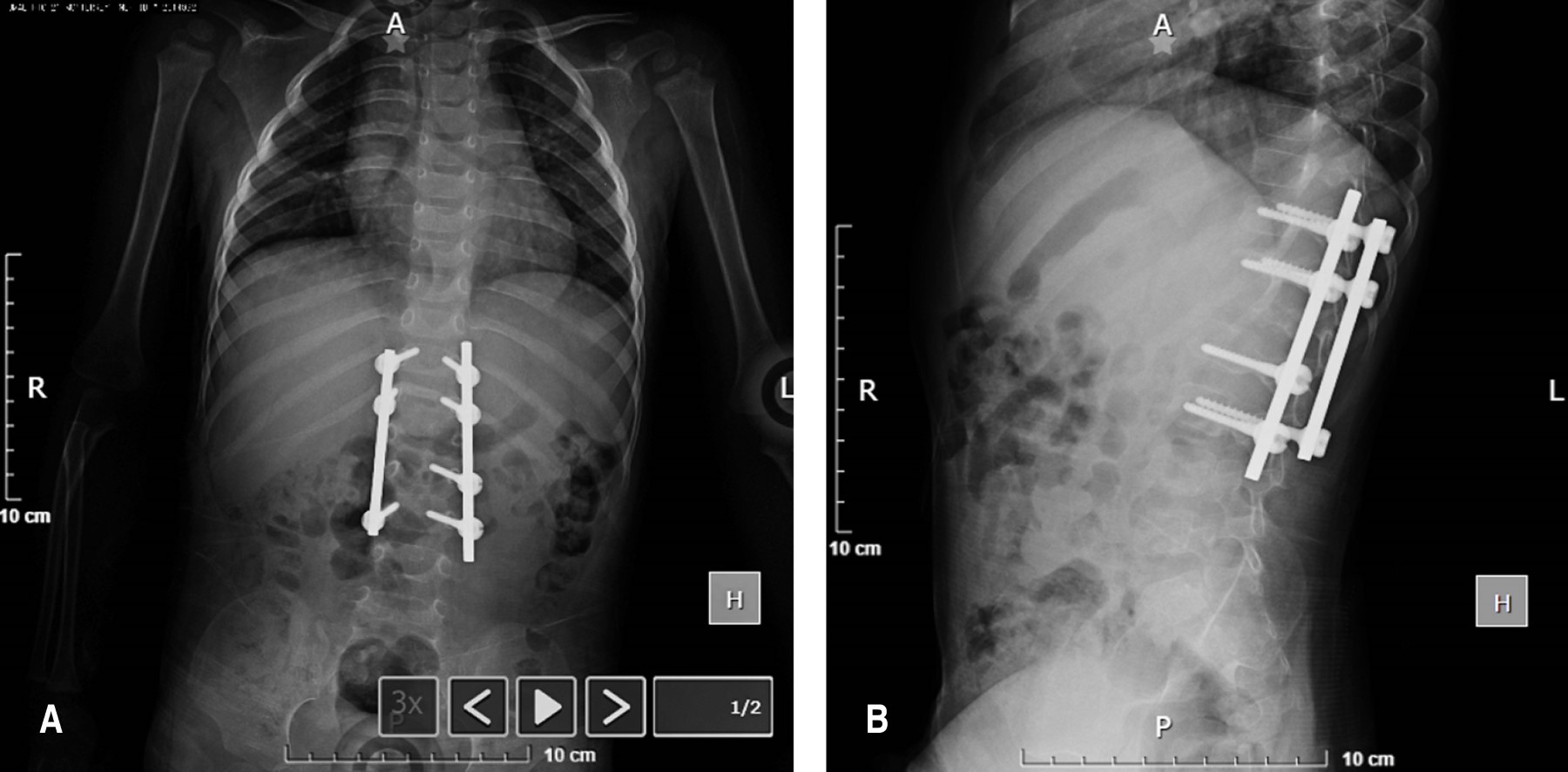 El paciente egresó del hospital a las 72 horas postquirúrgicas, cumpliendo con protocolo antimicrobiano y analgésico correspondiente, con adecuado control hemodinámico y seguimiento multidisciplinario por consulta externa con citas periódicas. Cada mes (durante los primeros seis meses) y cada dos meses (durante otros seis meses), con buena evolución: sitio quirúrgico con bordes bien afrontados, sin datos clínicos de infección o dehiscencia, con marcha independiente y no claudicante, miembros pélvicos con fuerza muscular 5/5 y sensibilidad 2/2. En la primer radiografía de control al mes de postquirúrgico se observó corrección de cifosis, material de osteosíntesis sin datos de solicitación ni aflojamiento (Figura 7). Se indicó uso de corset de toracolumbar bivalvado de manera permanente durante al menos 18 horas al día por 12 meses y mantuvo una terapia de tratamiento antifímico bajo supervisión por servicio de infectología pediátrica con buena mejoría clínica. Se plantea retirar la instrumentación en unos años para evitar secuelas en el crecimiento axial.