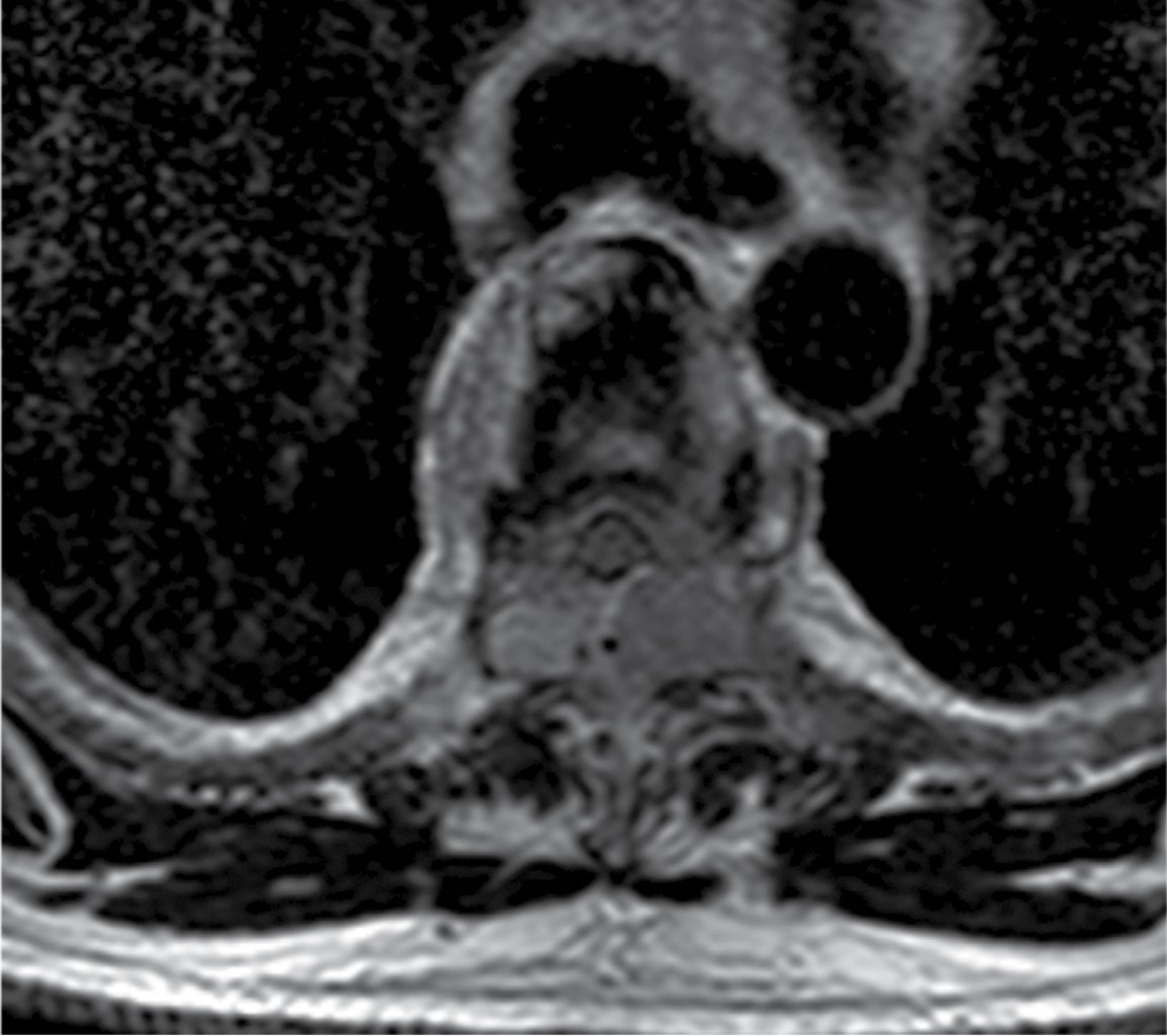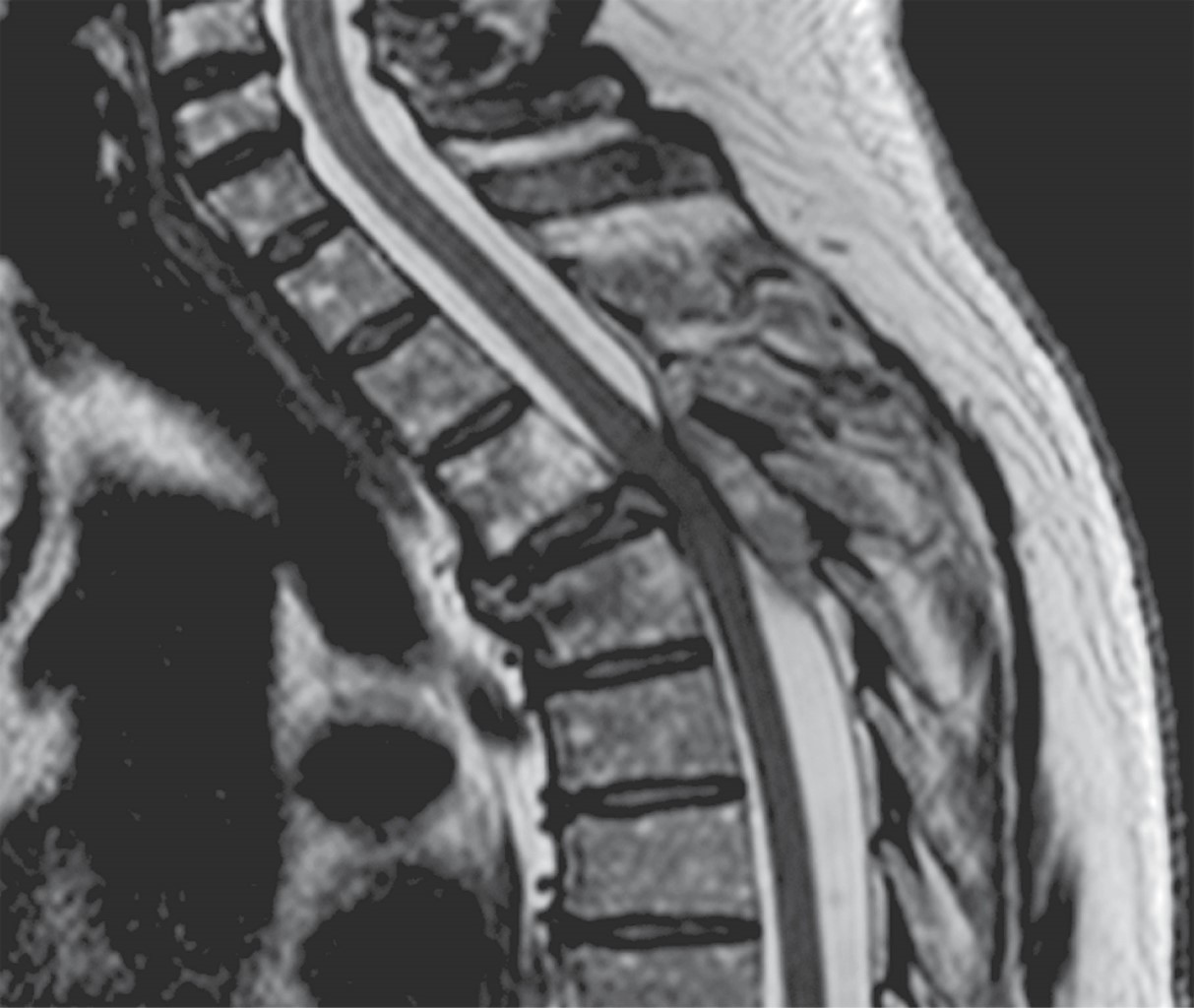 Paciente masculino de 52 años de edad, sin antecedentes personales patológicos de importancia. Inicia padecimiento de un mes de evolución caracterizado por dolor en región dorsal de tipo opresivo, intensidad 6/10 en la escala visual análoga (EVA), que se exacerba con los movimientos y disminuye con el reposo y el decúbito, acompañado de debilidad progresiva de extremidades inferiores, motivo por el cual acude a nuestra unidad para su valoración.