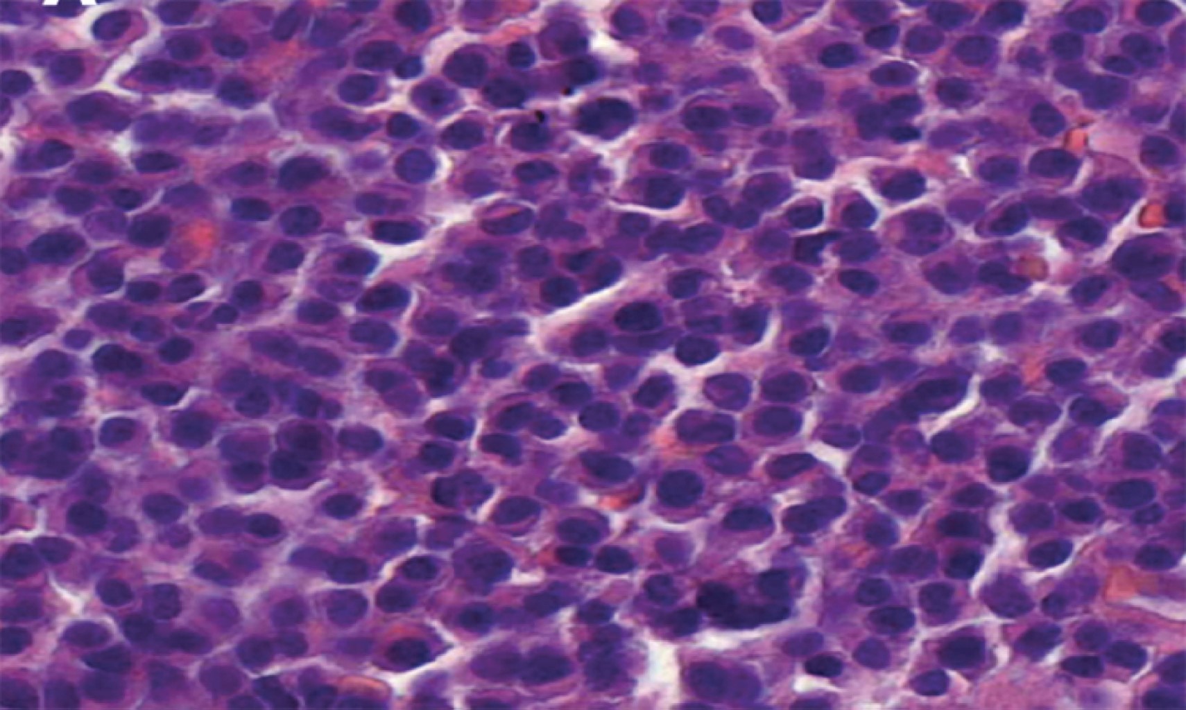 A la exploración neurológica con fuerza 1/5 en miembros inferiores se observa hipotonía, reflejos de estiramiento muscular de miembros inferiores 1/4, con hipoestesia por debajo de T4. Se realizó resonancia magnética en vista sagital secuencia T2, donde se aprecia lesión hipointensa epidural localizada en T4-T5 de bordes regulares con dimensiones de 35 × 6 mm que, de acuerdo con la clasificación de SINS, obtuvo puntaje de 4, catalogándose como columna inestable. Por lo anterior se decidió realizar cirugía, la cual consistió en hemilaminectomía de T4-T5 más exéresis tumoral, reportándose en el examen de patología transquirúrgico como plasmocitoma (Figuras 1, 2 y 3).