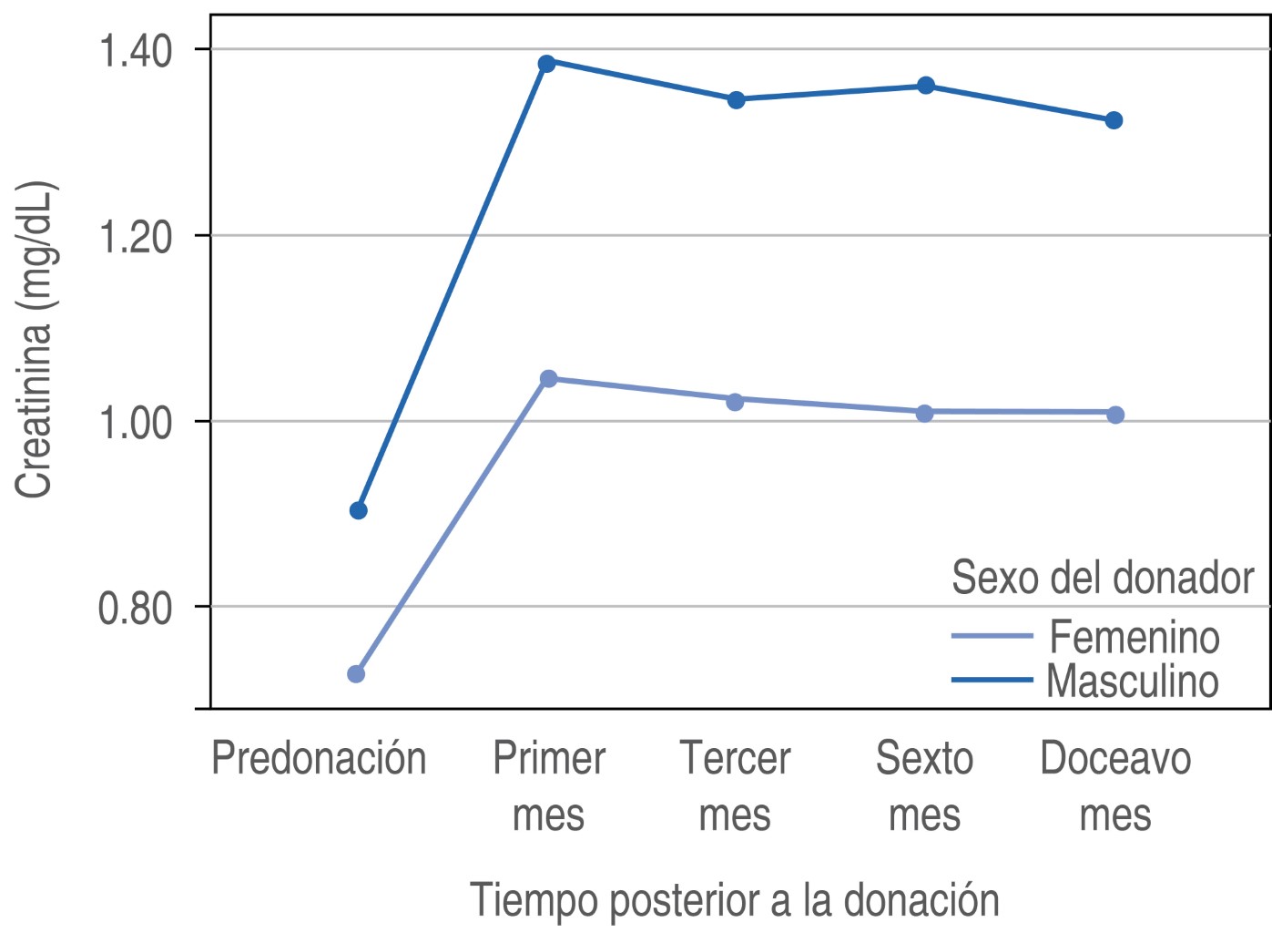 El conocimiento del comportamiento inmediato, mediato y a largo plazo de los donantes es imprescindible en la toma de decisiones de los grupos de trasplante; sin embargo, en el tema de donación y trasplante, la tendencia actual de los países está encaminada a un mayor número de trasplantes de donante fallecido. En la literatura consultada, intencionadamente se investigaron diferencias que pudieran observarse del funcionamiento renal por separación de grupos entre hombres y mujeres. Algunas concluyen que no hay diferencias o se asume que se hizo ajuste por sexo y que éste no tuvo relevancia en el funcionamiento renal posterior a la donación. Por ello la presente investigación trata de analizar el comportamiento de los valores bioquímicos de la creatinina sérica de acuerdo al sexo de los donantes.