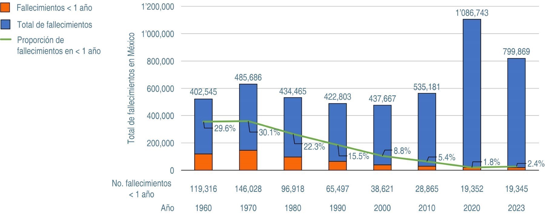 Los datos expuestos indican que la tendencia ascendente de la mortalidad infantil –que ya se señaló–, alcanzó su punto máximo en el año de 1970, con 146,028 muertes, equivalentes al 30.1% de todas las defunciones a nivel nacional. Pero a partir del año de 1980 es evidente la reducción sostenida, tanto en número absoluto como en su proporción respecto al total de defunciones. Es decir, en poco más de 40 años, el cambio fue de casi 20 puntos porcentuales, pasando de 21.5% en 1980, a 2.4% para el año 2023.