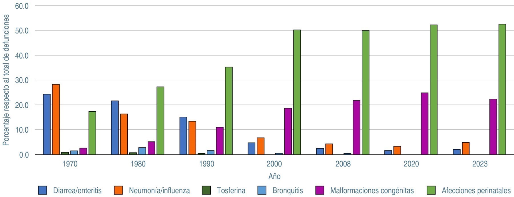 La identificación de las causas específicas de mortalidad infantil es indispensable para comprender los cambios en las tendencias descritas anteriormente.10 La Figura 3 ilustra la evolución de las principales causas de mortalidad infantil en México, entre 1970 y 2023. El gráfico se elaboró a partir de los registros históricos de estadísticas vitales, nacimientos y defunciones, recopilados por el Sistema Nacional de Vigilancia Epidemiológica y la Dirección General de Epidemiología de la Secretaría de Salud y reportes del INEGI.7-9 En general, en esos registros se incluyen las 20 causas más frecuentes de mortalidad infantil de cada año; sin embargo, para los propósitos de este artículo, solamente se informan las seis más frecuentes, lo cual representa alrededor del 75% del total de decesos. Los resultados se expresan en porcentajes, es decir, la proporción de defunciones por causa, respecto al total de defunciones en niños menores de un año. Además, es conveniente señalar que las afecciones perinatales corresponden a las muertes ocurridas desde la semana 22 de gestación hasta los primeros siete días de vida.