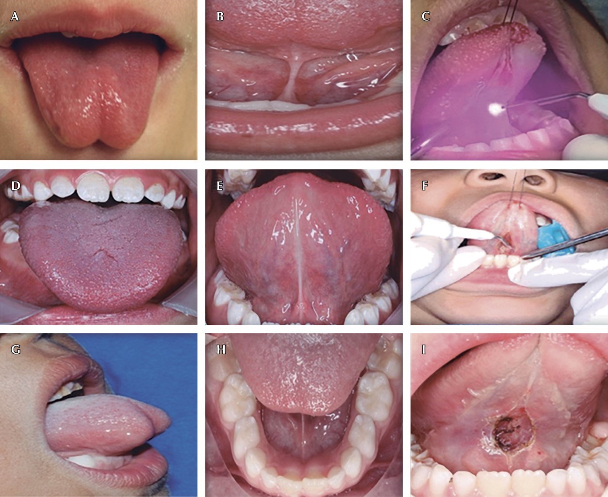 En la historia clínica no refiere ningún antecedente médico de importancia. En la exploración clínica intraoral se observó una lengua en forma de w, también conocida como lengua en forma de corazón por el frenillo lingual corto (Figura 1G). Presenta una anquiloglosia anterior tipo II según la clasificación de Coryllos (Figura 1H).