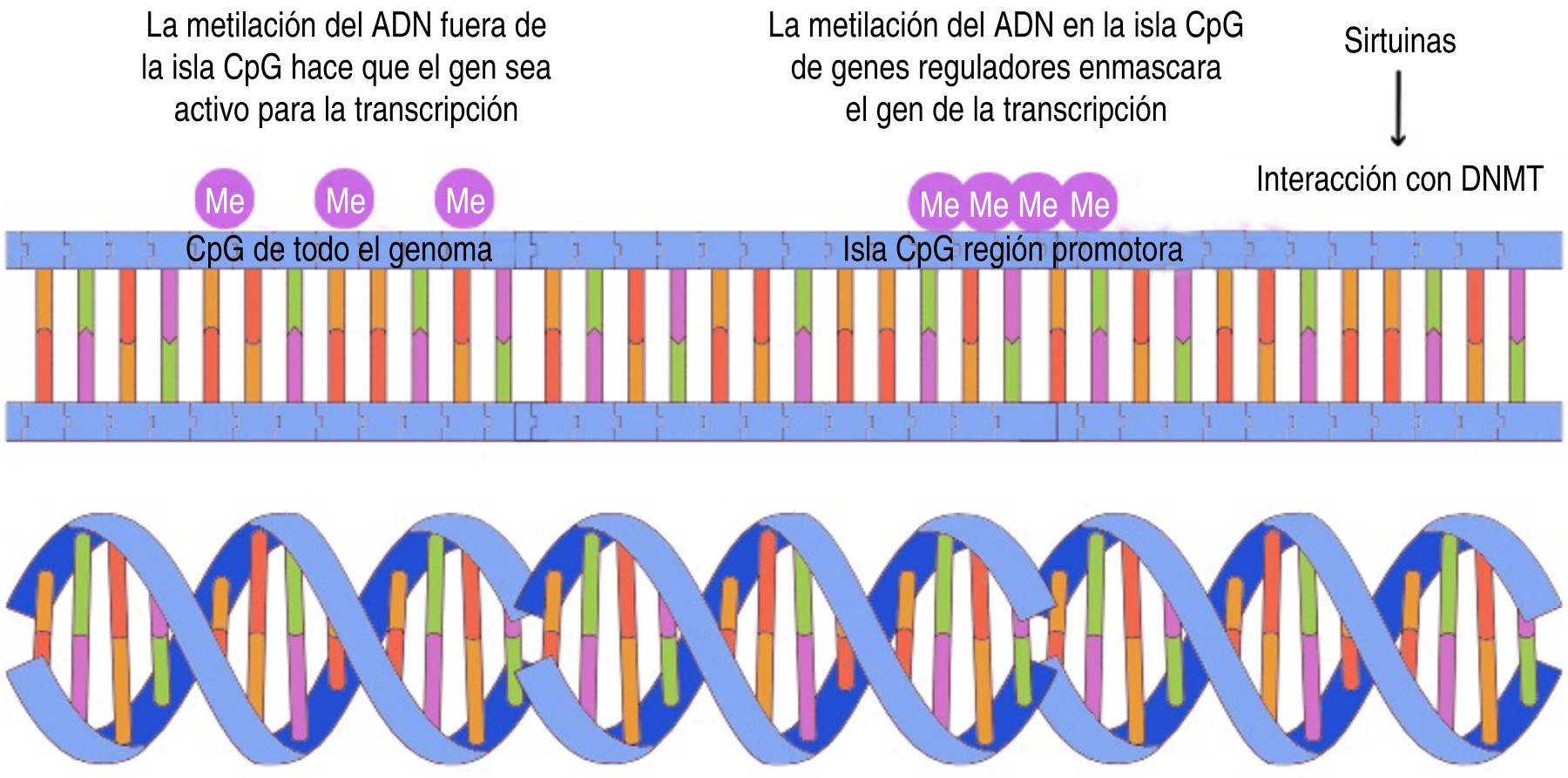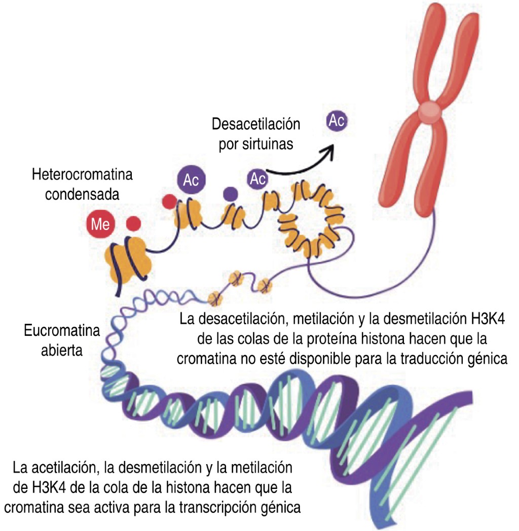Las sirtuinas son importantes reguladores epigenéticos mediante la desacetilación de las propias histonas y/o interacciones con otras proteínas que controlan la acetilación de las histonas o las enzimas de metilación del ADN.4