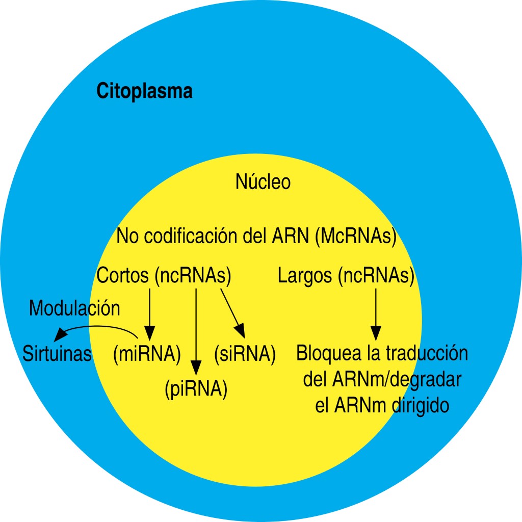 - 3. ARN no codificantes: los ARN no codificantes (ARNnc) regulan la expresión de otros genes postranscripcionalmente. Los ARNnc se clasifican en pequeños y largos. Los ARNnc pequeños se subdividen en micro ARN (miARN), que son los más estudiados; se forman dentro de un núcleo y se liberan al citoplasma para silenciar postranscripcionalmente casi el 60% de los genes codificantes de proteínas, inactivando los ARNm que se encuentran en el citoplasma (Figura 4).4