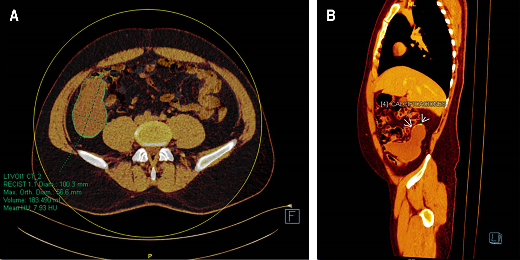Paciente masculino de 35 años, sin antecedentes patológicos relevantes, consulta por dolor abdominal compatible con cólico vesicular de 48 horas de evolución. Se realiza ultrasonido abdominal, que confirma colelitiasis sin signos de colecistitis aguda. Como hallazgo incidental, se identifica una lesión quística bien definida en región retrocecal de 15 × 4.8 × 4 cm, sin signos de inflamación, con morfología compatible con mucocele apendicular. Se complementa el estudio con una TC abdominal, que revela apéndice retrocecal tubular, sobredistendido, con contenido hipodenso homogéneo y sin realce con contraste; diámetro apendicular de 10 × 5.6 cm, volumen de 183 ml y presencia de calcificaciones laminares en extremo distal del apéndice. No se evidencian lesiones nodulares, realce anormal o discontinuidad en la pared apendicular. La grasa periapendicular muestra densidad conservada, sin invasión a estructuras adyacentes ni adenopatías (Figura 1).