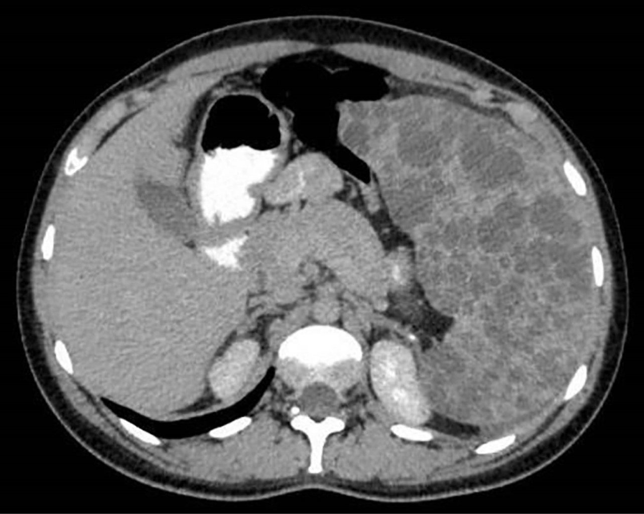 Entre 80-90% de los casos de linfangiomas esplénicos ocurren en niños menores de dos años, en los pacientes adultos son muy raros.1 La mayoría son idiopáticos, de naturaleza benigna y asintomática, por lo tanto, se tratan con un manejo conservador. Sólo casos raros causan esplenomegalia.2 El diagnóstico final se basa en una combinación de hallazgos clínicos, radiológicos e histopatológicos. Con la comprensión de la importancia de las funciones inmunes esplénicas tanto en niños como en adultos, se han producido cambios con respecto al manejo quirúrgico y el abordaje de las lesiones esplénicas.3-6 En cuanto a las características por imagen, son lesiones hipo o anecoicas detectadas por ecografía, masas de baja atenuación y sin realce detectadas por tomografía, e intensidad de señal alta en T2 y baja en T1 en la resonancia magnética (RMN).7 En algunos casos también se describen diferentes características de imagen de los linfangiomas esplénicos, como una masa sólida-quística, ecogenicidad levemente aumentada en la ecografía y realce del contraste de relleno en las imágenes de tomografía tardías y resonancia magnética. Sin embargo, un linfangioma esplénico solitario es difícil de diferenciar de un hemangioma quístico esplénico o un tumor metastásico.8,9