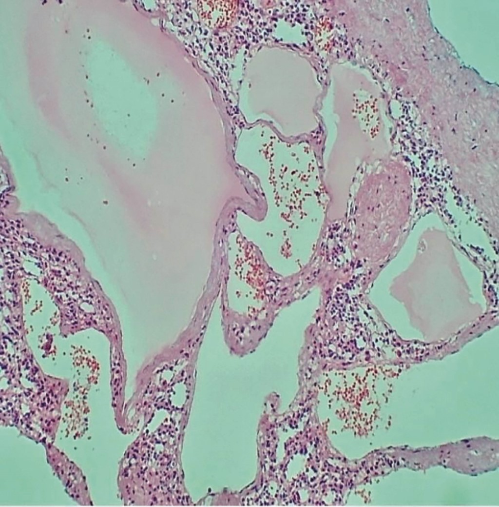 Presentamos el caso de una mujer de 27 años de edad sin antecedentes cronicodegenerativos ni quirúrgicos de importancia. Inició su padecimiento de un mes de evolución, con presencia de cefalea leve, malestar al comer y náuseas, por lo que acudió a valoración médica no especializada. Se prescribe una ecografía abdominal que reporta un tumor esplénico como hallazgo principal. Es referida a consulta médica de especialidad en cirugía general. A la exploración física se encontró abdomen globoso a expensas de visceromegalia, blando, pero no depresible en cuadrante superior y flanco izquierdos, no doloroso, sin datos de irritación peritoneal, extremidades íntegras, con hipotonía en extremidad pélvica izquierda y presencia de hemangioma subcutáneo en miembros pélvicos, sin limitación en los arcos de movimiento. Se realizaron estudios de laboratorio que reportaron de relevante sólo anemia leve (11.6 g/dL) y leucopenia (3.2 × 109/L). La tomografía de abdomen simple reportó esplenomegalia severa, con múltiples imágenes nodulares e hiperdensas, asociado a heterogeneidad del plano graso peritoneal del interior del hueco pélvico, observando imágenes nodulares hiperdensas sugerentes de tejido ganglionar calcificado (Figura 1). Se decidió programar a la paciente para esplenectomía laparoscópica mano asistida por el tamaño del tumor, previo protocolo quirúrgico completo se ingresó a paciente a quirófano, se inició procedimiento, con abordaje laparoscópico abierto, supraumbilical y en línea media con incisión de 8 cm disecando por planos hasta la cavidad, bajo visión directa se colocaron trocares de trabajo, disección mano asistida de hilio esplénico y las fijaciones ligamentosas con energía ultrasónica y bipolar avanzada presentando hemostasia difícil debido a las dimensiones del bazo. Se colocaron Hem-O-Locks proximales y distales, así como clips de titanio, obteniendo hemostasia, se introdujo pieza quirúrgica en bolsa extractora, y se extrajo de la cavidad peritoneal mediante morcelación manual, sin complicaciones, se verifica hemostasia y limpieza de cavidad con 3 litros de solución estéril (Figura 2). Se retiraron trócares y se afrontaron incisiones por planos. La paciente se mantuvo con evolución favorable durante su estancia hospitalaria, sin referir ninguna sintomatología, se egresó al tercer día del periodo posquirúrgico. El resultado de patología reportó bazo multifragmentado y deformado, 33 × 20 × 8 cm de tamaño, peso de 1,180 gramos, con linfagioma esplénico difuso, áreas de parénquima esplénica con esplenitis crónica con congestión y dilatación vascular (Figuras 3, 4 y 5). Se continuó con seguimiento por la consulta externa a los siete y 21 días de la cirugía con evolución favorable. Al día 10 se sometió a doble esquema de vacunación contra Streptococcus pneumonie (Neumococo) y Neisseria meningitidis (Meningococo) sin eventos adversos.