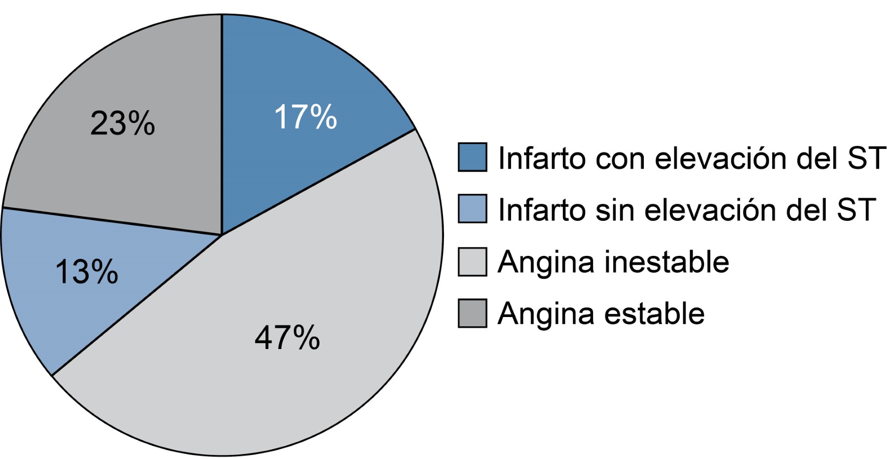 Del total de la muestra, 57% presentaba el antecedente de tabaquismo, 37% alcoholismo y en su minoría consumo de cocaína. Cincuenta y seis punto siete por ciento presentaba diabetes, 50% hipertensión, 30% obesidad y 53% sobrepeso con IMC de 28.7 en promedio. Respecto a los hallazgos de laboratorio, el valor promedio de colesterol total de los pacientes fue 180 mg/dL, lipoproteínas de baja densidad (LDL) 120.4 mg/dL, triglicéridos 191 mg/dL y lipoproteínas de alta densidad (HDL) 41.2 mg/dL. En cuanto a los resultados del BNP se encontraron valores con una media de 182 pg/mL. En la mayoría de los casos la angiografía coronaria se realizó por diagnóstico de infarto sin elevación del segmento ST (47%) y en el resto por angina inestable (13%), infarto con elevación del segmento ST (17%) y angina estable (23%) (Figura 1).
