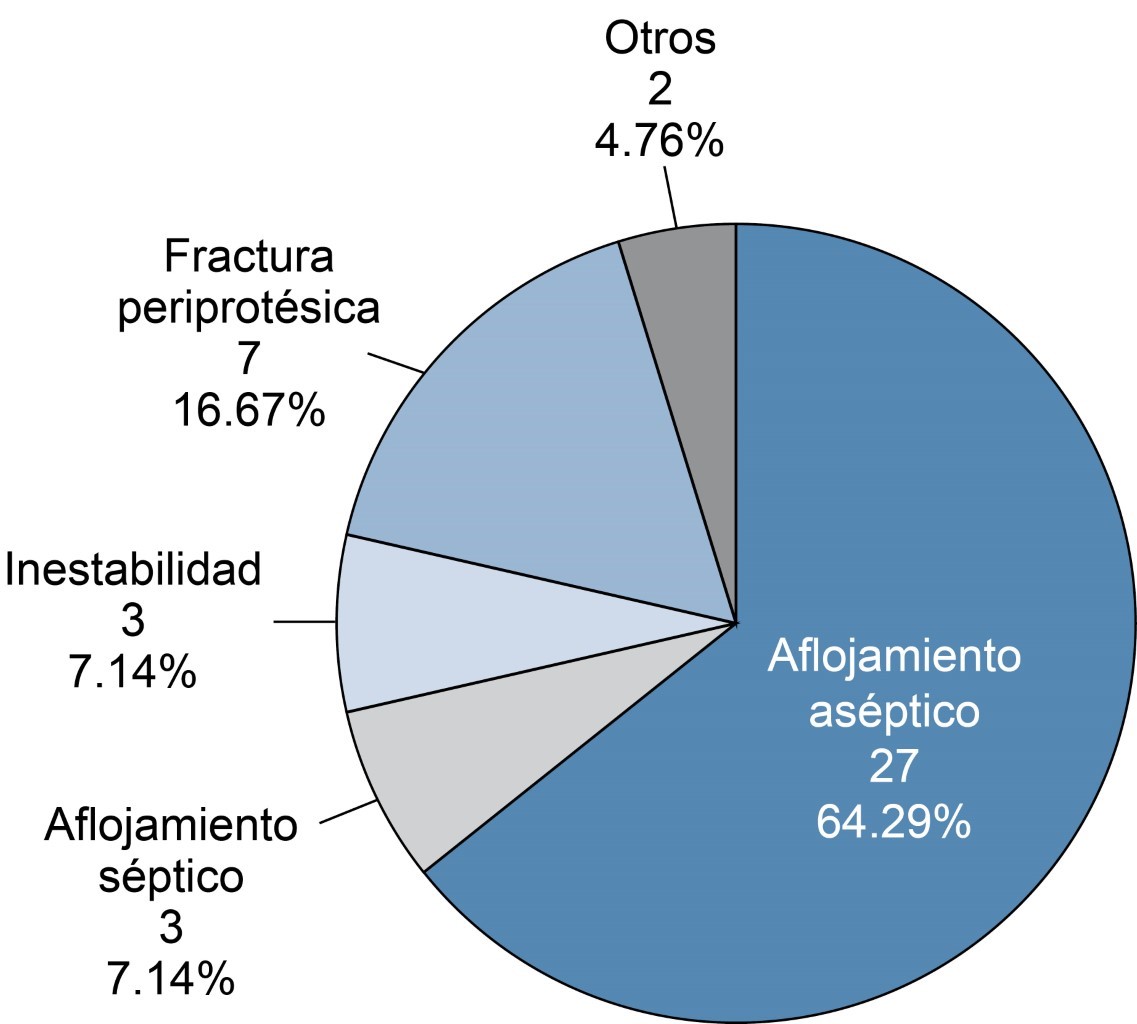 El tiempo promedio en que se realizó la colocación de la prótesis primaria y la necesidad de la cirugía de revisión es de 4.5 años, encontrándose pacientes con la necesidad de realizar una reintervención dentro de los primeros cinco años, denominando 27 (64.2%) pacientes con falla temprana y 15 (35.8%) con falla tardía, o sea, aquéllos que se reintervienen cinco años después de la artroplastia primaria. Encontrando en ambos casos al aflojamiento aséptico y la fractura periprotésica como dos primeras causas, a diferencia de lo reportado en el ámbito internacional (Figura 3).