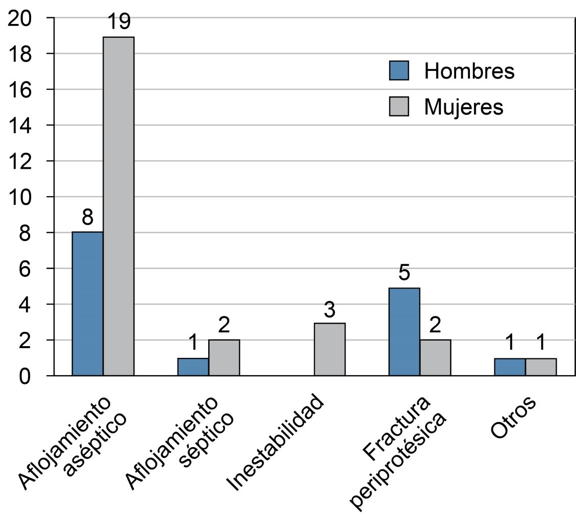 Hemos encontrado que nuestras causas principales de revisión son el aflojamiento aséptico y la fractura periprotésica, a diferencia de la bibliografía internacional, donde se reporta una mayor incidencia en aflojamiento aséptico, inestabilidad e infección periprotésica (Figura 1).4-6,8-12