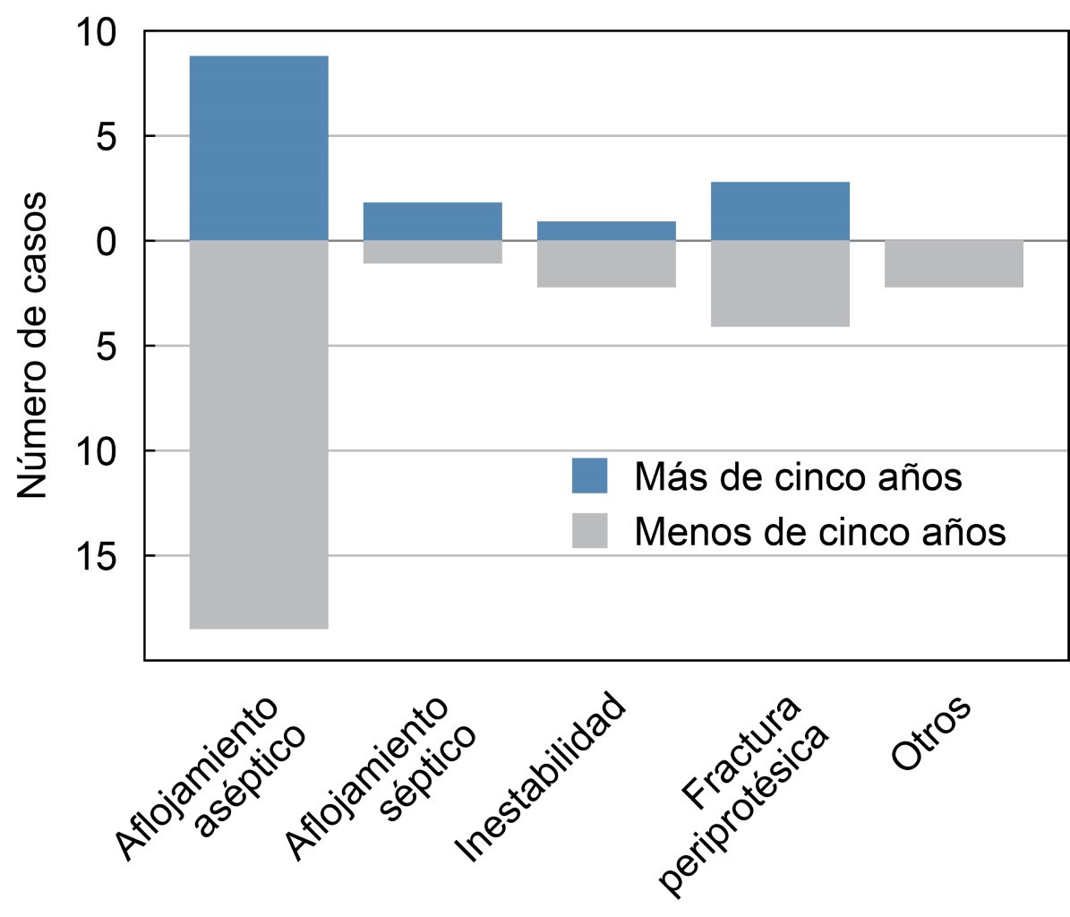 Al revisar los fallos tempranos, o aquéllos reintervenidos dentro de los primeros cinco años después de la artroplastia primaria, nos encontramos con un mayor porcentaje (64.2%). Dentro de esta sección se encuentran principalmente aquéllos diagnosticados con aflojamiento aséptico (66.6%) y fractura periprotésica (14.8%) en segundo lugar, siendo diferente a otros reportes, donde se encuentra el aflojamiento aséptico e inestabilidad como dos primeras causas de revisión temprana.4 De igual manera, en nuestros casos reintervenidos de manera tardía (35.8%), nos encontramos con aflojamiento aséptico (60%) y fractura periprotésica (20%) como principales causas, en contraste con aflojamiento séptico, inestabilidad e infección periprotésica reportadas en otras investigaciones.19,25