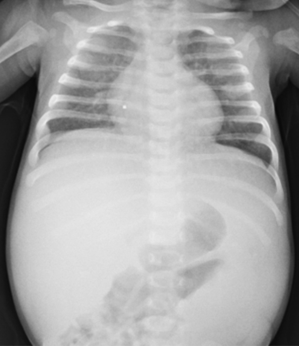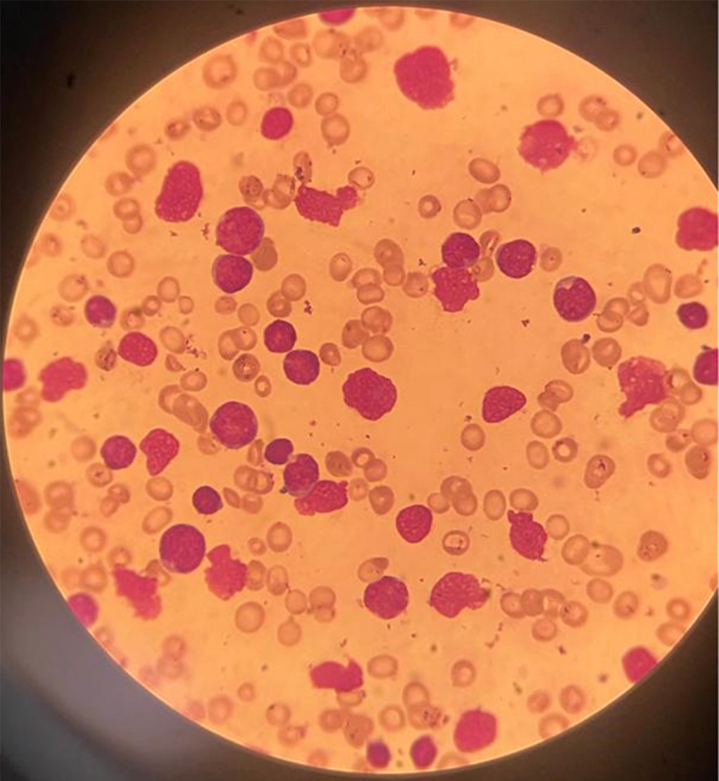 Femenino de dos meses de edad previamente sana. Acude a nuestro hospital por un mes de evolución con distensión abdominal, palidez y petequias en extremidades. A su valoración estaba irritable, pálida, con petequias generalizadas, dificultad respiratoria moderada, hepatoesplenomegalia, taquicardia y SatO2 ambiental en 89%. Sus exámenes reportaron bicitopenia e hiperleucocitosis, sin hallazgos de síndrome de lisis tumoral (Tabla 1). La radiografía de tórax (Figura 1) tenía infiltrados bilaterales. El aspirado de médula ósea reportó blastos 95.5% tipo morfológico L1 (Figura 2) y el inmunofenotipo leucemia linfoblástica aguda Pro-B con translocación cromosomal 12;21.