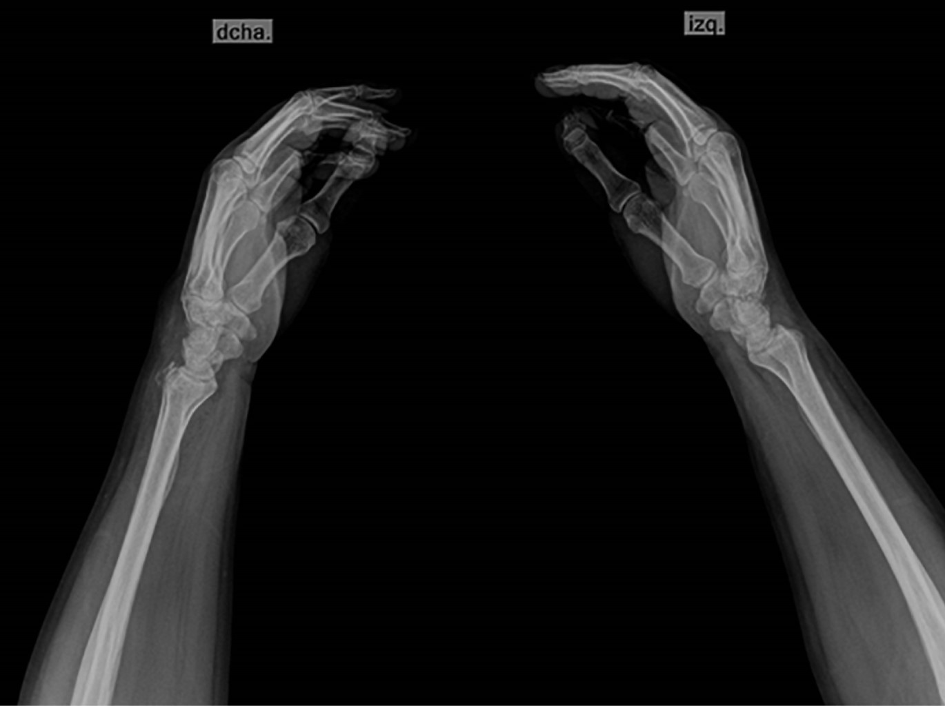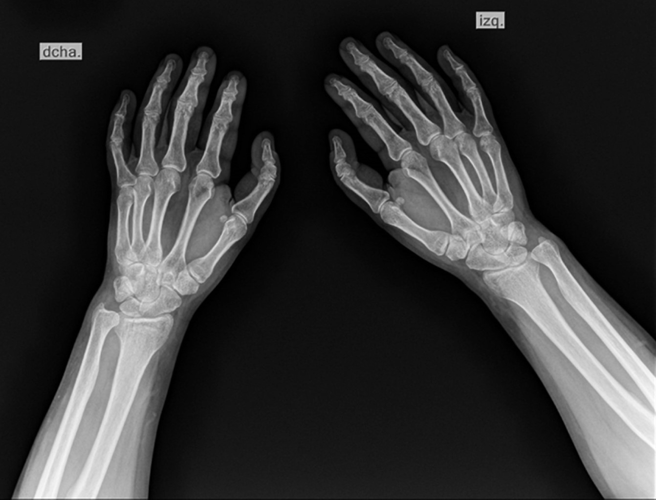 A su ingreso se evalúa por el Servicio de Ortopedia del hospital y se solicitan estudios complementarios por sospecha de fractura. En proyecciones dorsopalmar (Figura 1) y lateral (Figura 2) de ambas manos (con dificultad para su adquisición debido a la limitación de la movilidad por trauma reciente) se evidencia trazo de fractura de la apófisis estiloides de ambas muñecas y de la faceta articular del radio distal bilateral. De forma incidental, se observa pulgar trifalángico bilateral, sin referir sintomatología a este nivel previo al evento traumático.