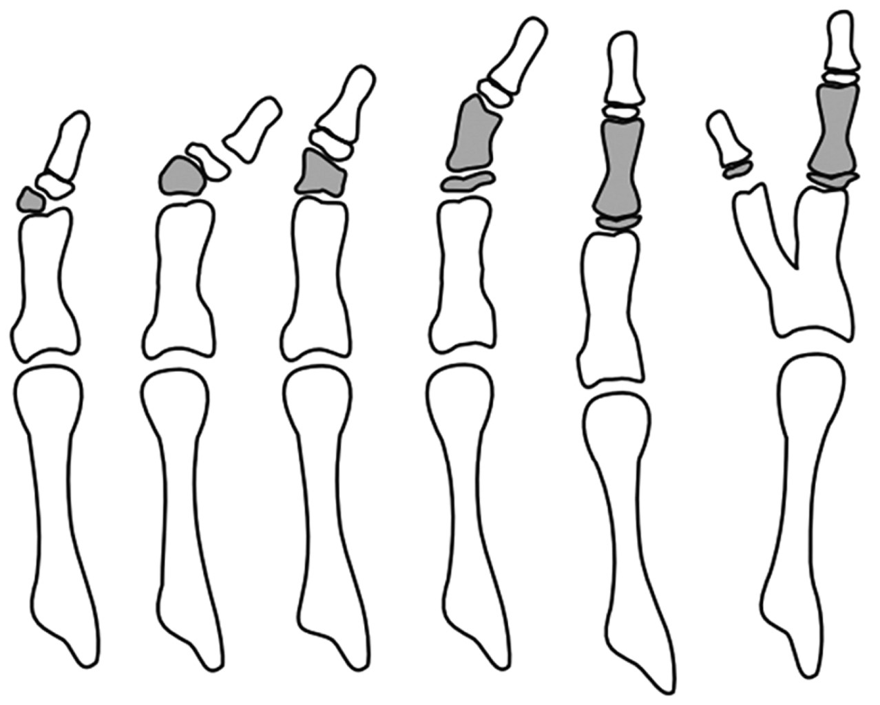 Esta variante del pulgar es considerada una polidactilia preaxial, en este caso, es de tipo II dentro de los defectos de diferenciación o anomalías de fusión/separación.3 Algunos autores refieren este hallazgo como una "mano de cinco dedos" haciendo referencia a la longitud del pulgar que es similar a la de los demás dedos. Una clasificación publicada en 1989 por Dieter Buck-Gramcko reporta seis tipos con la finalidad de proponer tratamiento para cada uno de ellos (Figura 3).2 Otra clasificación hecha por Wood es por la forma de la falange extra: en cuña, trapezoide o rectangular, basada en Buck-Gramcko. En un artículo publicado por Potuijt y colaboradores, se menciona que, aunque es una anomalía rara, el pulgar trifalángico podría tener alguna relación en la biología evolutiva y genética molecular.
