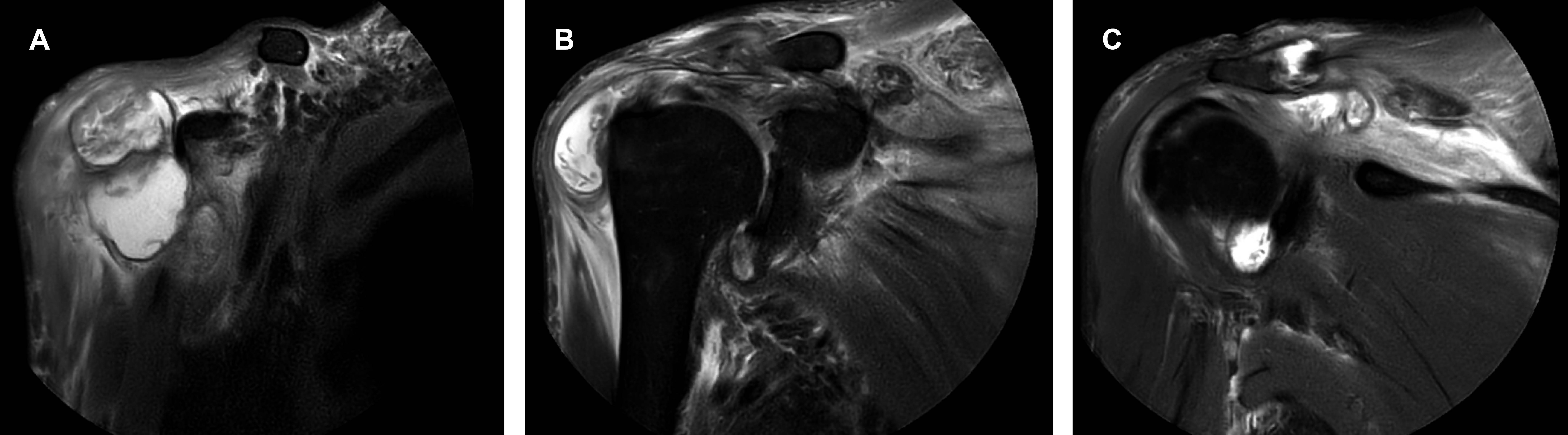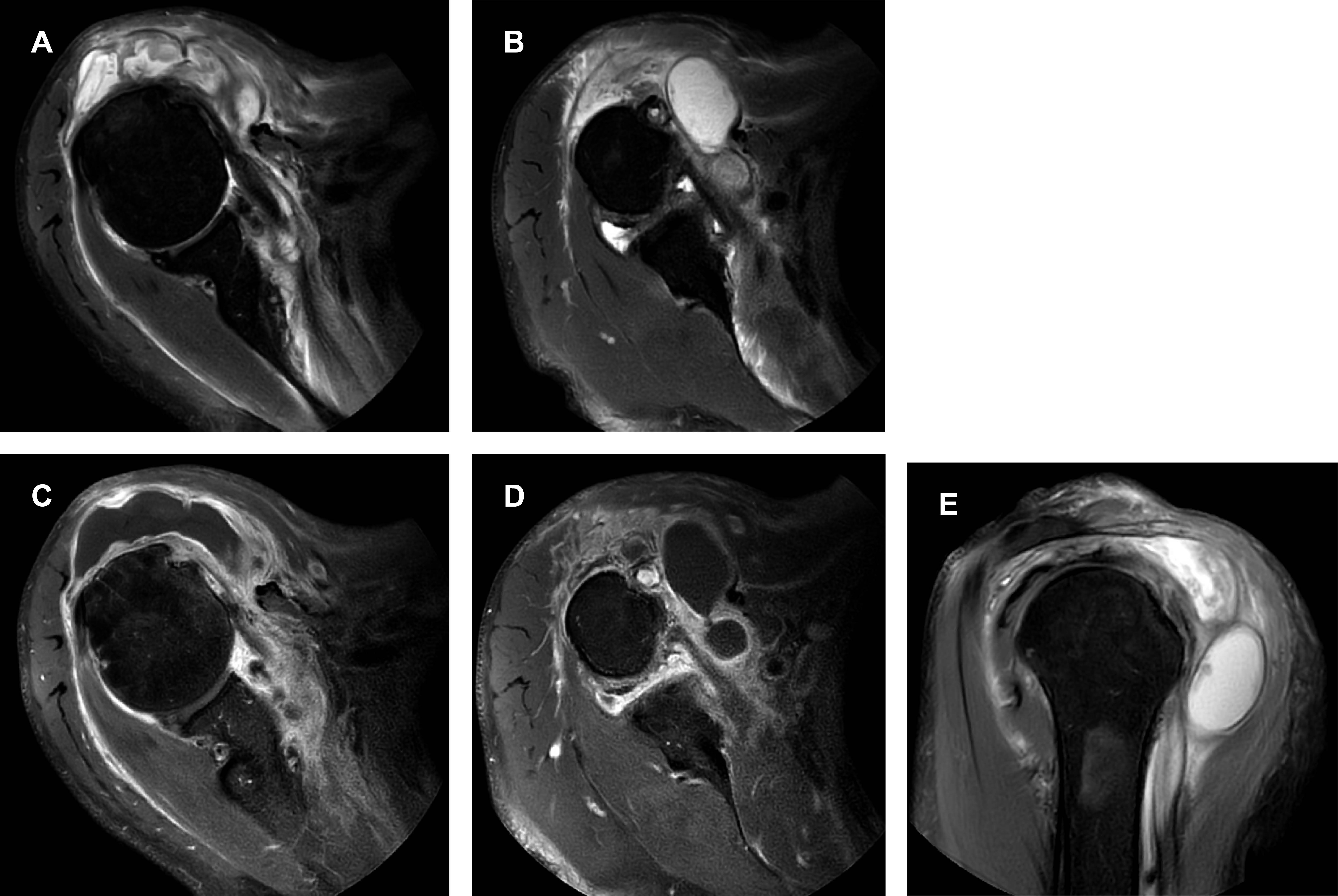 Se observó aumento de volumen de los tejidos blandos, cambios por miositis a nivel del infraespinoso, subescapular, redondo menor, bíceps. Colecciones en topografía del supraespinoso, subescapular y en la región anterior del hombro, se asocia con aumento de volumen de las bursas, con reforzamiento periférico tras el contraste, con mayor afectación de la bursa subacromial, subdeltoidea. Tal como lo podemos observar en las Figuras 1 y 2. La sinovial con aumento de volumen y reforzamiento heterogéneo leve.