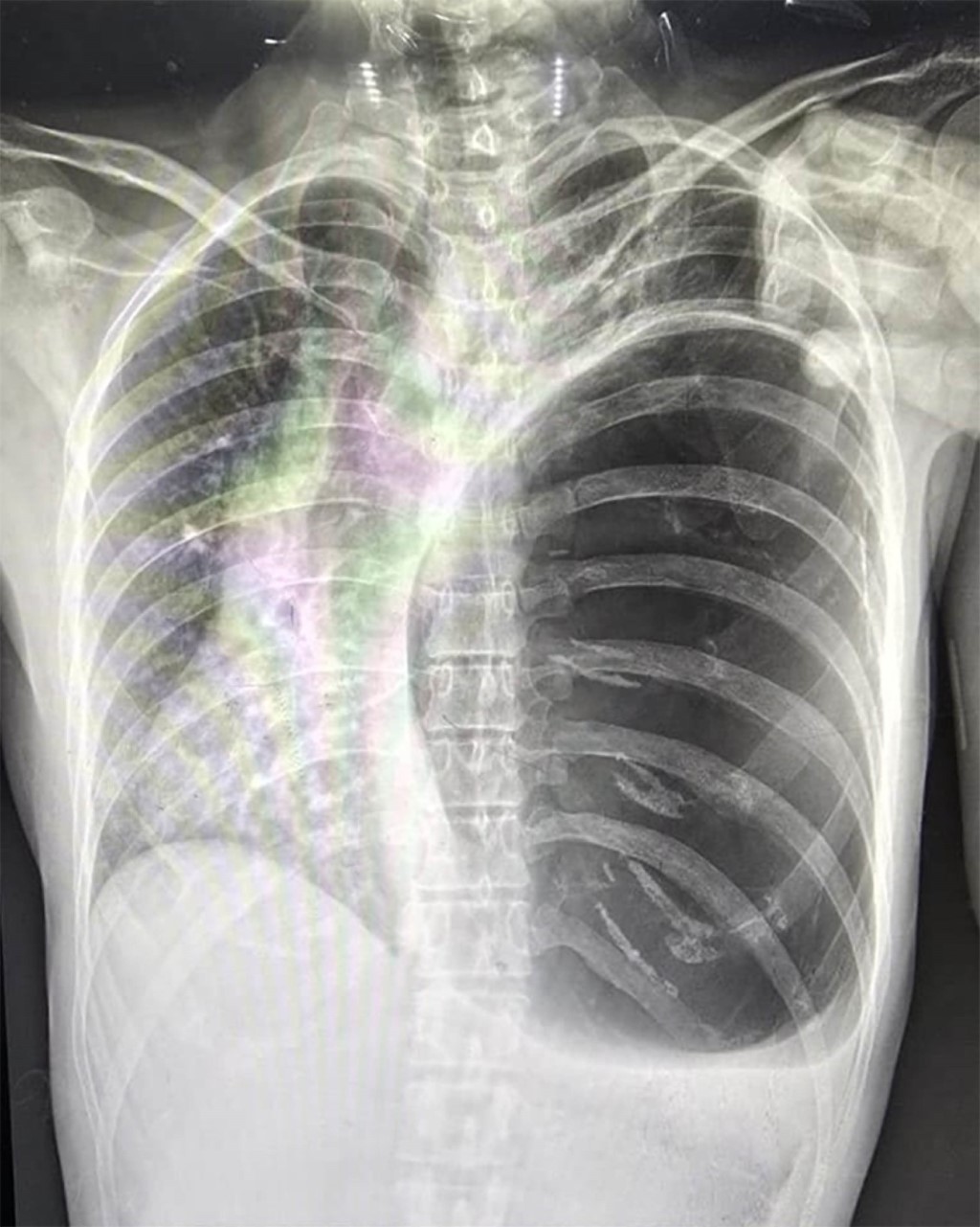 Ferreira Junior EG, Costa PA, Silveira LMFG, Almeida LEM, Salvioni NCP, Loureiro BM. Giant bullous emphysema mistaken for traumatic pneumothorax. Int J Surg Case Rep. 2019;56:50-54. doi: 10.1016/j.ijscr.2019.02.005.