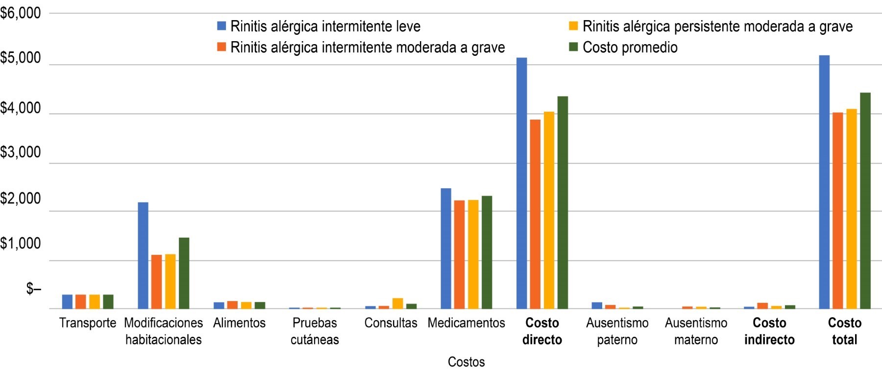 Los resultados se presentan gráficamente en las Figuras 1, 2, 3, 4 y 5, mostrando la distribución de costos por tipo y severidad de rinitis alérgica. La información detallada de los costos por paciente y por categoría se encuentra en la Tabla 1.