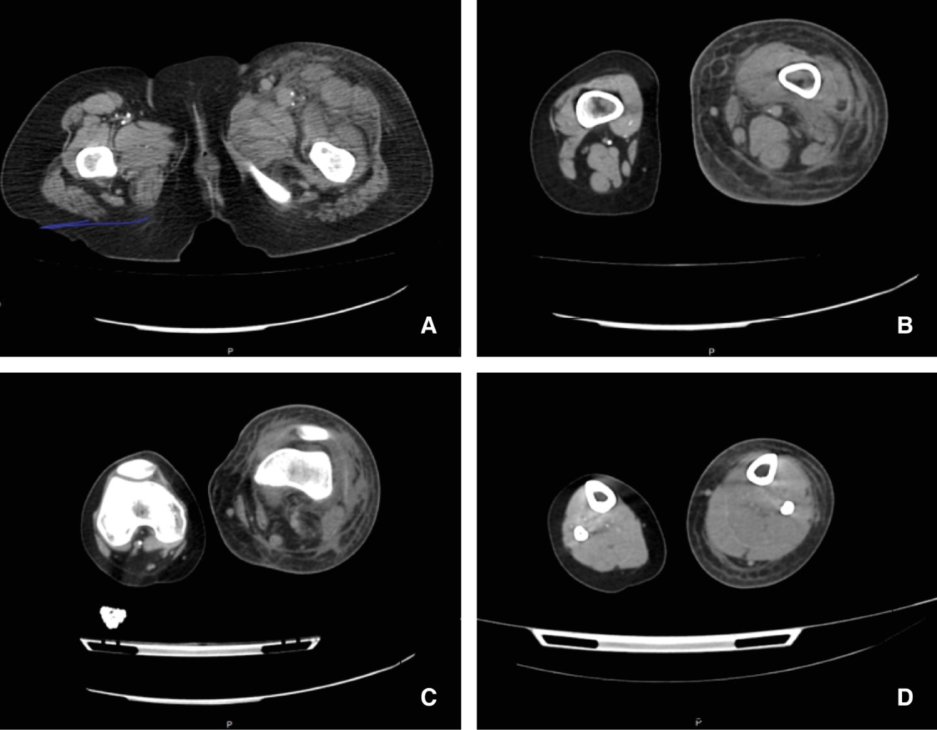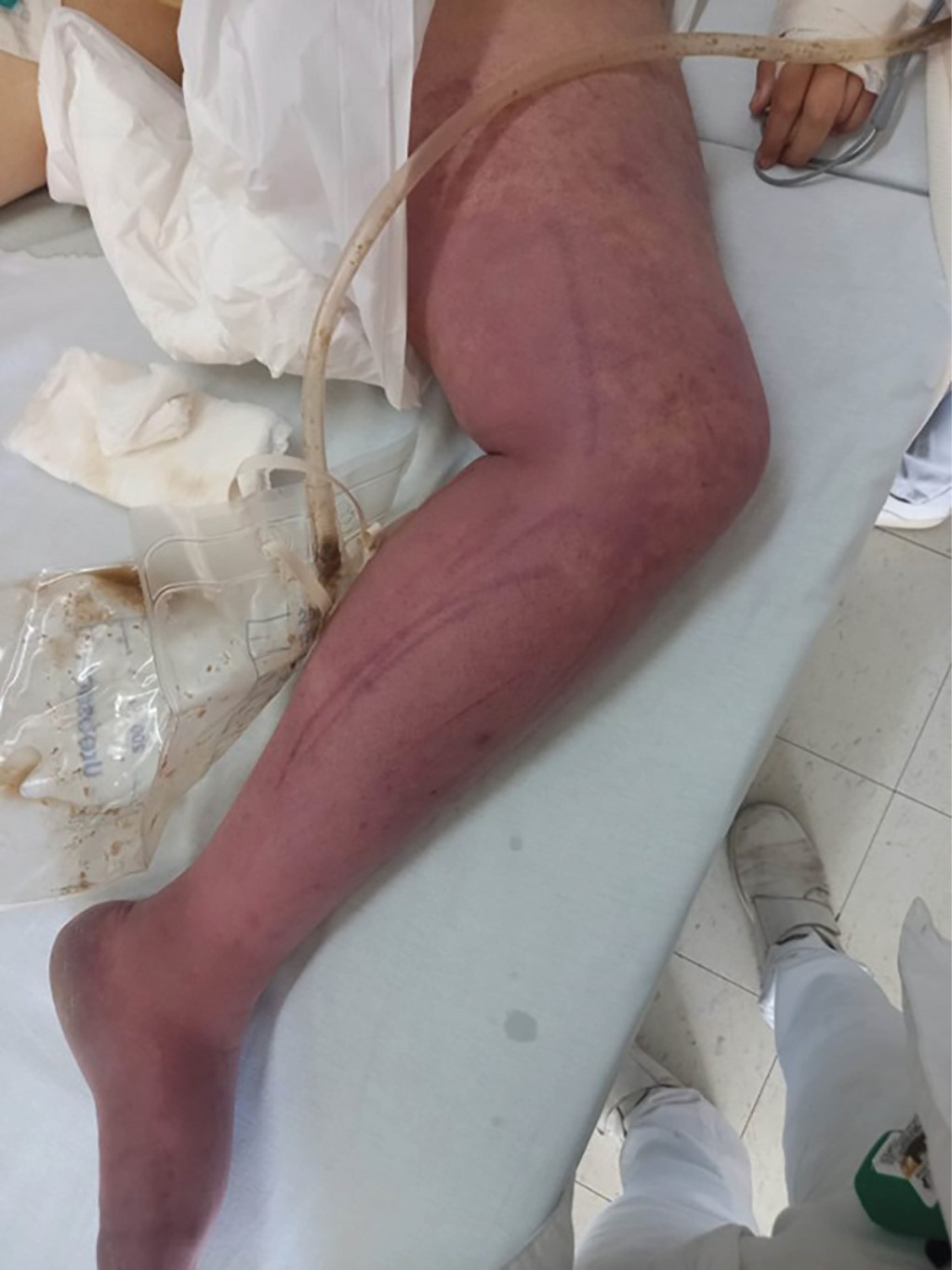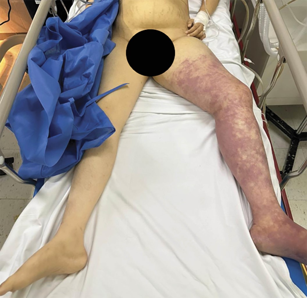 A su llegada se encuentra somnolienta (Glasgow 8), con bradicardia, hipotensión e hipoxemia. Se inicia manejo avanzado de la vía aérea. A la exploración física se encuentra extremidad inferior izquierda con empastamiento muscular a nivel de mulso y pantorrilla, edematosa, fría y con coloración reticulada, no se palpan pulsos poplíteos ni infrapoplíteos (Figura 1).