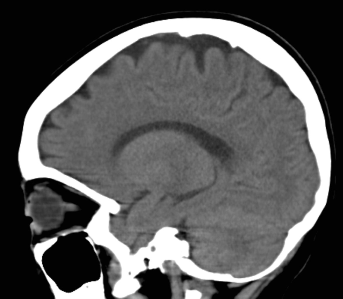 El análisis del electrocardiograma evidencia taquicardia sinusal sin otra alteración. Radiografía de tórax sin lesiones. Ante la sospecha de trombosis arterial se solicita ultrasonido Doppler de emergencia que reporta trombosis venosa profunda y superficial de miembro pélvico izquierdo, arteria iliaca externa permeable, arteria poplítea izquierda presentando flujo en su interior, no audible y sin espectro Doppler (Figura 2). Se realiza angiotomografía contrastada que evidencia edema de tejidos blandos, disminución del calibre de arteria femoral del lado izquierdo en tercio medio y distal, sin paso de contraste a partir de la arteria poplítea, trombosis venosa superficial y profunda en extremidad izquierda, extremidad derecha sin alteraciones (Figura 3). Tomografía de cráneo sin evidencia de patología (Figura 4). Inicia manejo con anticoagulación (enoxaparina), pentoxifilina, terapia hídrica con soporte con aminas vasoactivas (adrenalina y dobutamina) y antibiótico de amplio espectro (ceftriaxona), además de transfusión de hemoderivados e ingreso a Unidad de Terapia Intensiva Pediátrica.