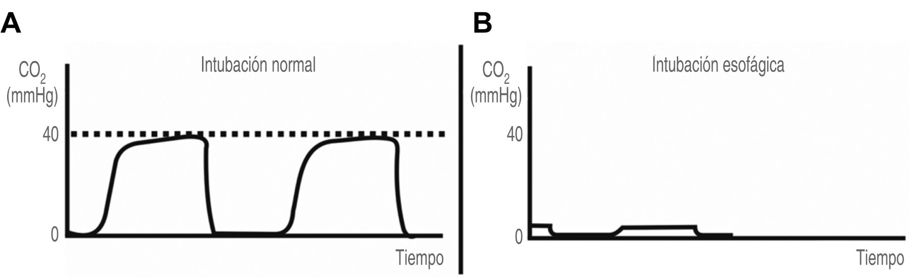 Actualmente, los profesionales sanitarios pueden emplear la capnografía tras intubar a un paciente para confirmar la colocación correcta del TET, monitorizar la calidad de la reanimación cardiopulmonar (RCP) y controlar la ventilación durante la asistencia al paciente con sospecha de hipertensión intracraneal (HIC) situaciones de atención prioritaria en el paciente con trauma. De las tres, la indicación más relevante y con mayor evidencia científica es la confirmación de la correcta colocación del TET. La intubación esofágica no reconocida es una complicación potencialmente fatal si no se solventa rápidamente. En nuestro medio, su incidencia se estima en torno al 15%(6). Diferentes estudios publicados en los últimos años concluyen que los métodos clínicos empleados para la confirmación de la posición del TET (auscultación pulmonar y en el estómago, movimientos torácicos, vapor en el tubo, etcétera) deben complementarse con un método objetivo, como es la capnografía, para reducir la incidencia de intubaciones esofágicas(6) (Figura 1).