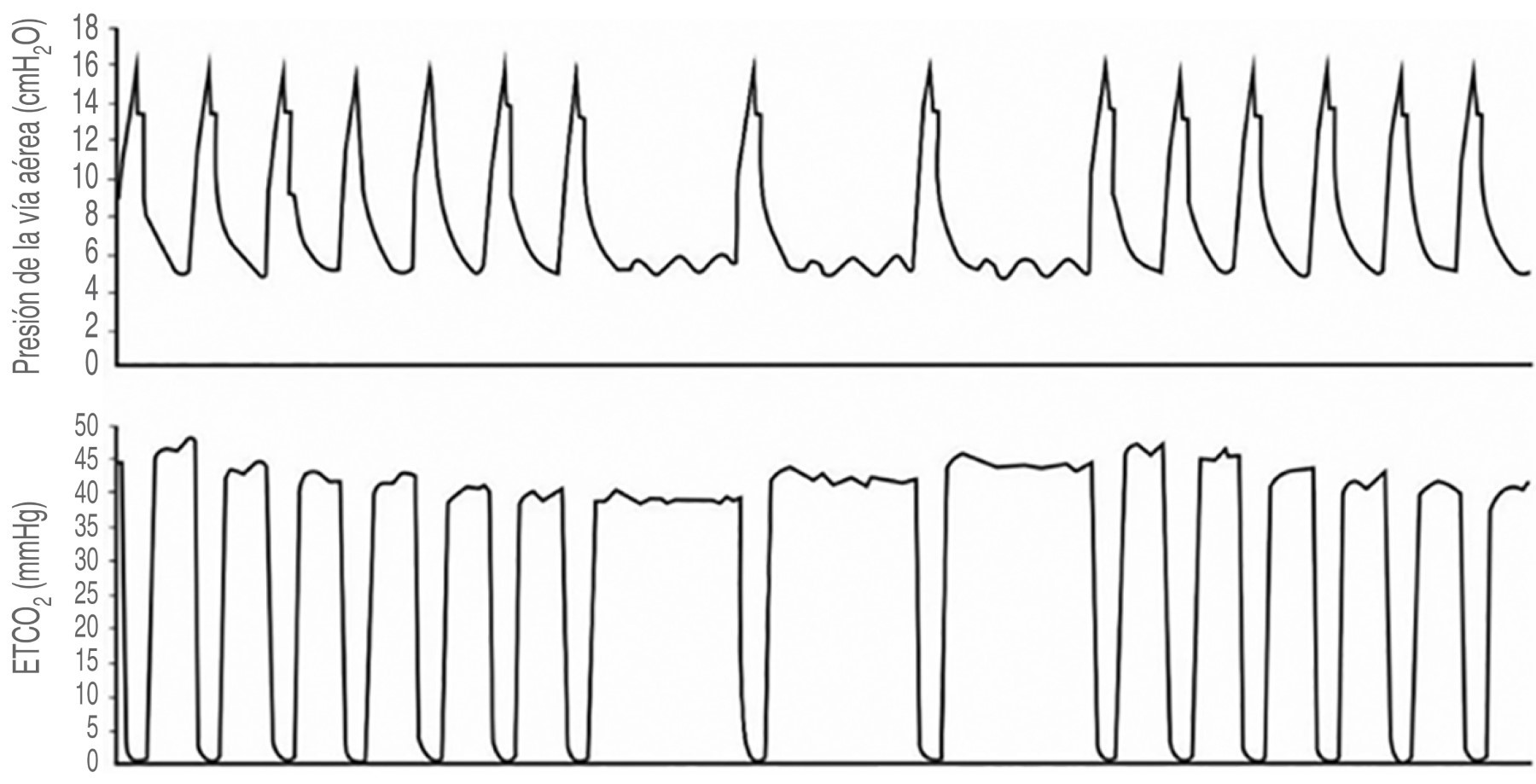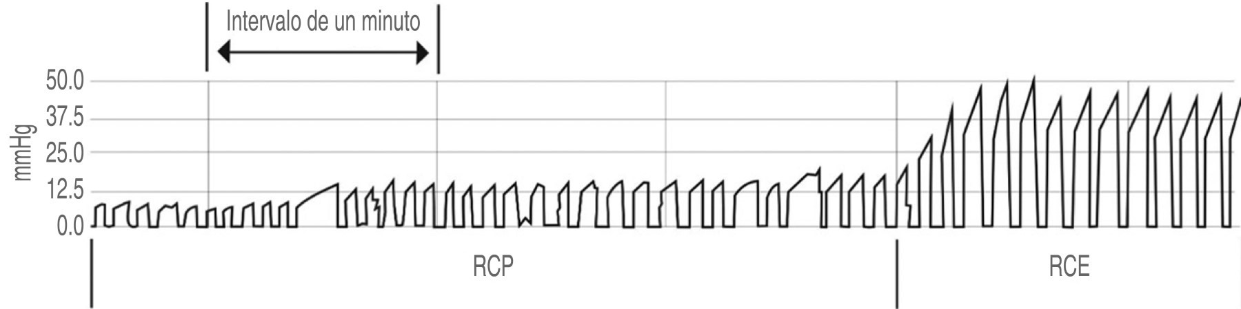 Las sociedades científicas han recomendado la capnografía durante las maniobras de RCP para una correcta monitorización de la intubación orotraqueal con la finalidad de generar una RCP de alta calidad, y para la detección temprana del retorno a la circulación espontánea (RCE)(7) (Figura 2). En la validez de este parámetro, como indicador predictivo y pronóstico del resultado de un paro cardíaco, se ha correlacionando la baja probabilidad de supervivencia de los pacientes recién intubados con aquellos que muestran valores < 10 mmHg o el mismo nivel después de 20 minutos de reanimación(8).